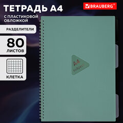 Тетрадь обложка пластик, А4 80 л., гребень мягкий, вырубка для ручки, клетка, BRAUBERG, светло-зеленый, 405373