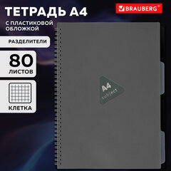 Тетрадь обложка пластик, А4 80 л., гребень мягкий, вырубка для ручки, клетка, BRAUBERG, серый, 405372