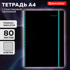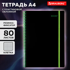 Тетрадь обложка пластик, А4 80 л., спираль пластик, резинка, клетка, BRAUBERG, черный/зеленый, 405383