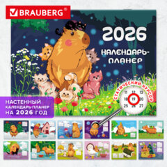 Календарь-планер настенный перекидной на 2026 г., BRAUBERG, 12 листов, 29,5х21,3 см, «Капибара», 116953