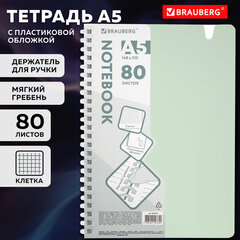 Тетрадь обложка пластик, А5 80 л., гребень мягкий, вырубка для ручки, клетка, BRAUBERG, светло-зеленый, 405378