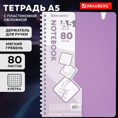 Тетрадь обложка пластик, А5 80 л., гребень мягкий, вырубка для ручки, клетка, BRAUBERG, сиреневый, 405379
