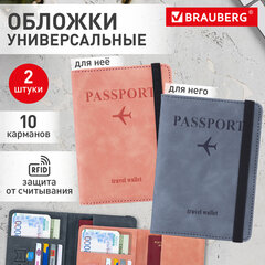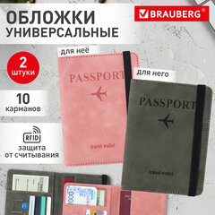 Обложка для паспорта и документов с защитой НАБОР 2 шт., 9 карманов, резинка, экокожа, графитовая/