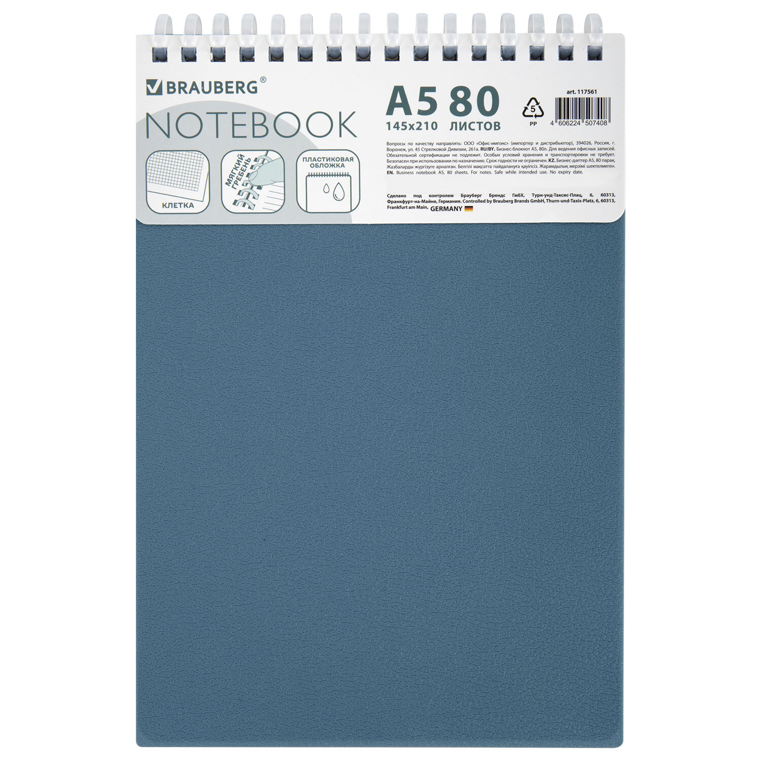 Блокнот А5, 80 л., силиконовый гребень, обложка пластик, клетка, BRAUBERG, синий, 117561