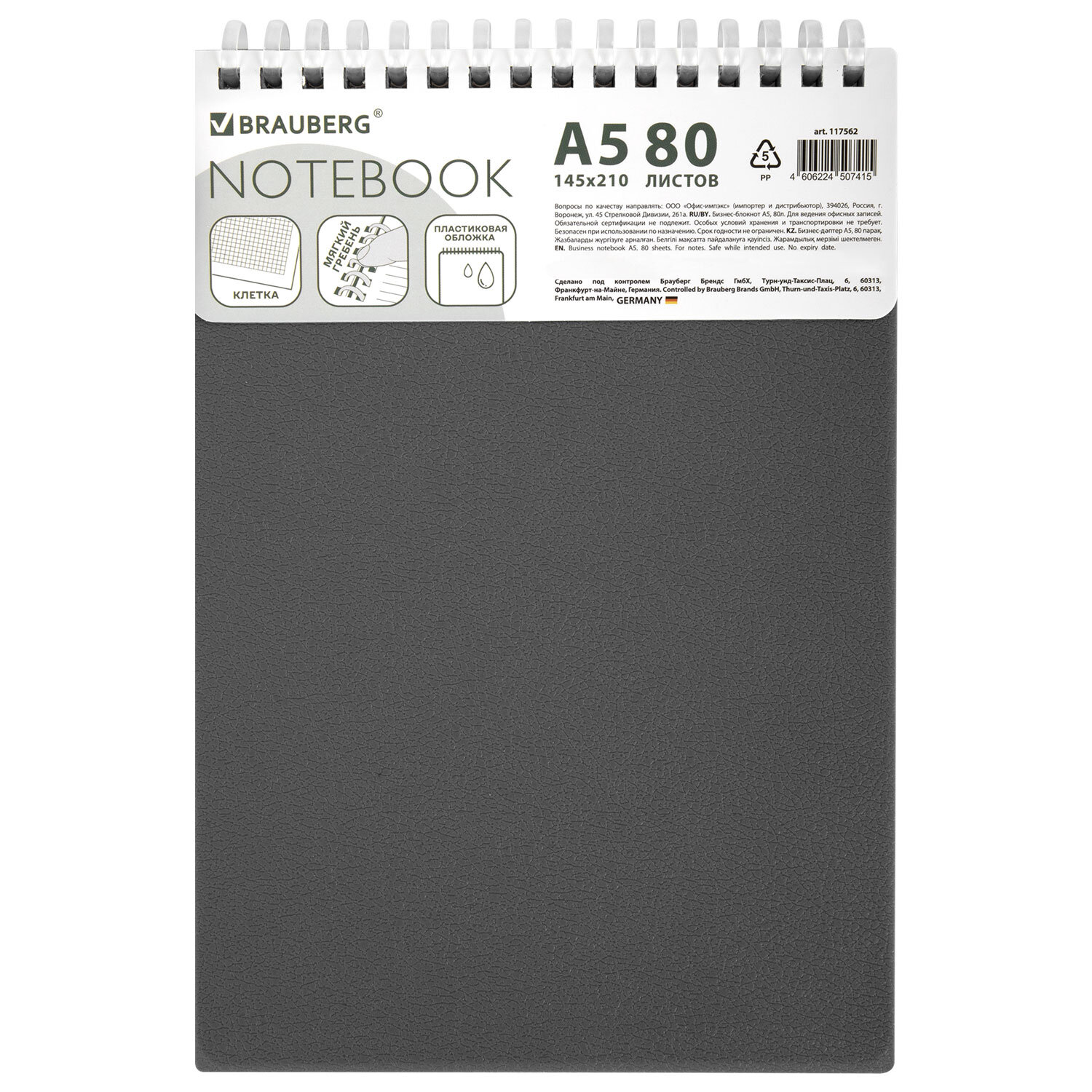 Блокнот А5, 80 л., силиконовый гребень, обложка пластик, клетка, BRAUBERG, серый, 117562
