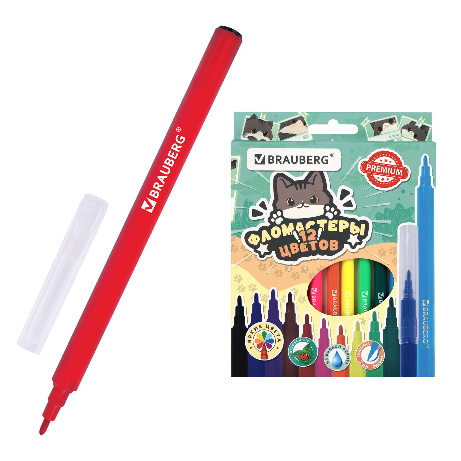 Набор фломастеров BRAUBERG «МИЛЫЕ КОТЫ» с насыщенными, яркими цветами в количестве 12 штук. Чернила на водной основе практически не имеют запаха, не токсичны и легко смываются с большинства материалов и тканей.