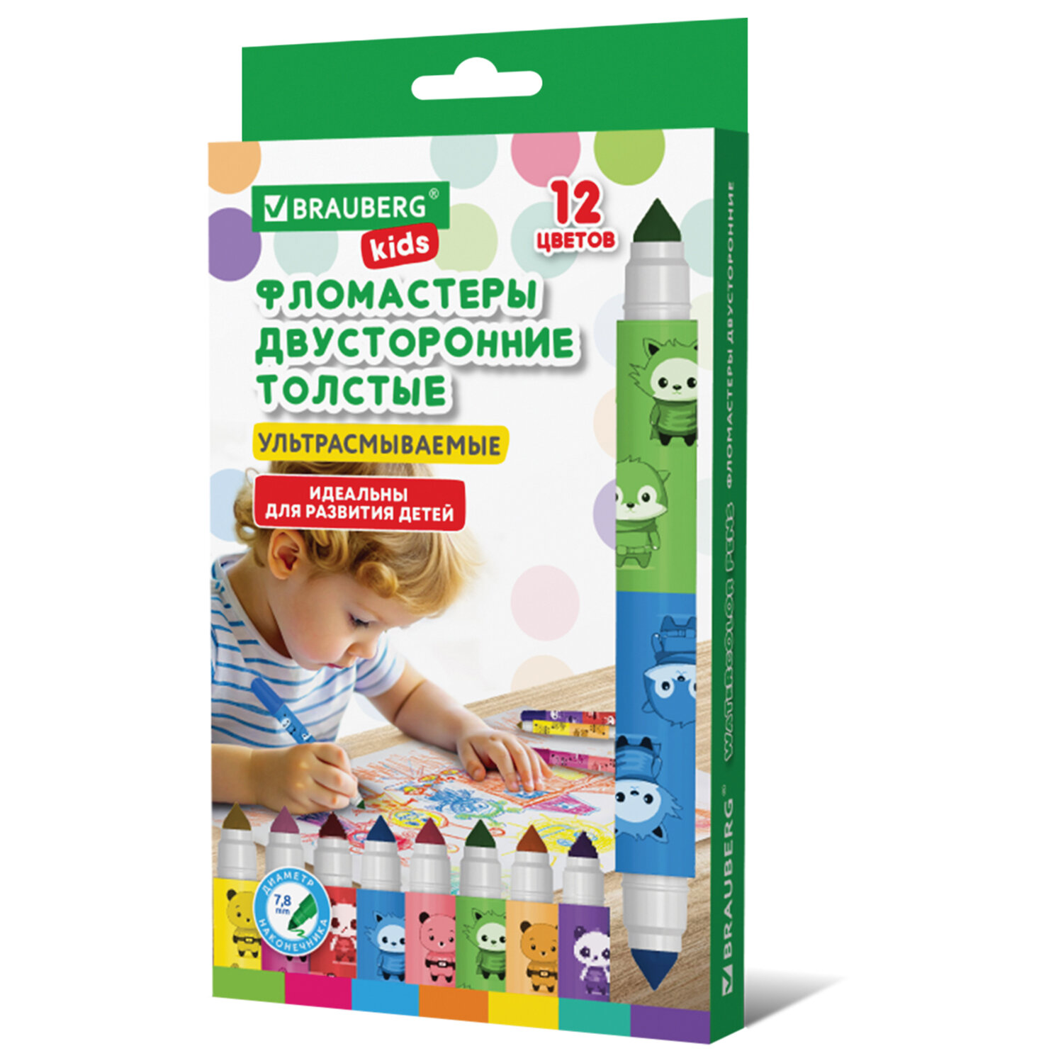 Фломастеры двусторонние толстые для малышей ультрасмываемые 6 штук / 12 цветов, BRAUBERG KIDS, 152625