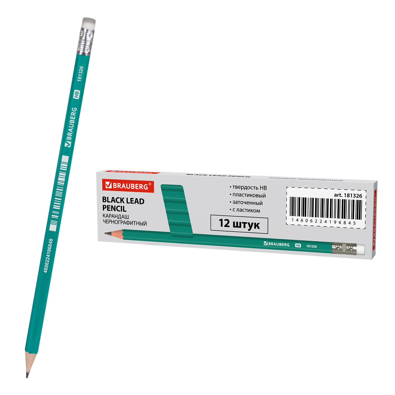 Изготовлен из высококачественного пластика, оснащен ластиком. Имеет шестигранное сечение. Карандаш длиной 185 мм легко точится и не крошится. Обладает средней степенью твердости – HB. Диаметр грифеля – 2,2 мм. Выполнен в зеленом цвете. Поставляется заточенным.