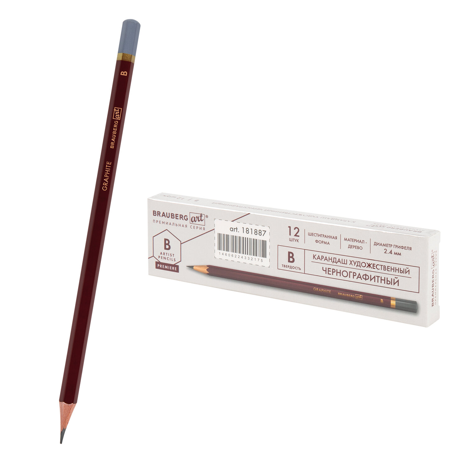Карандаш чернографитный художественный B, 1 шт., BRAUBERG ART "PREMIERE", ВЫСШЕЕ КАЧЕСТВО, 181887