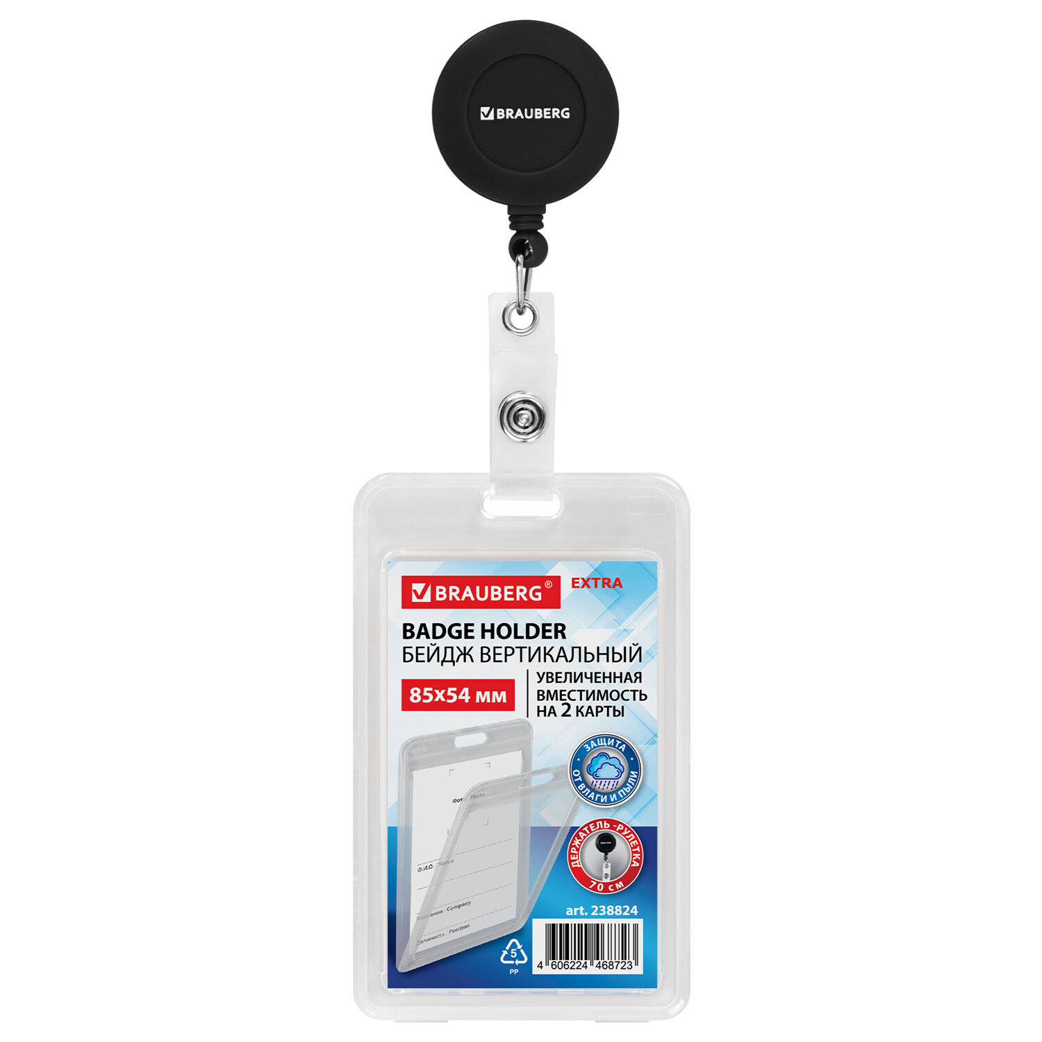 Бейдж вертикальный (85х54 мм) на 2 карты, с рулеткой, ЗАЩИТА ОТ ВЛАГИ И ПЫЛИ, BRAUBERG EXTRA, 238824