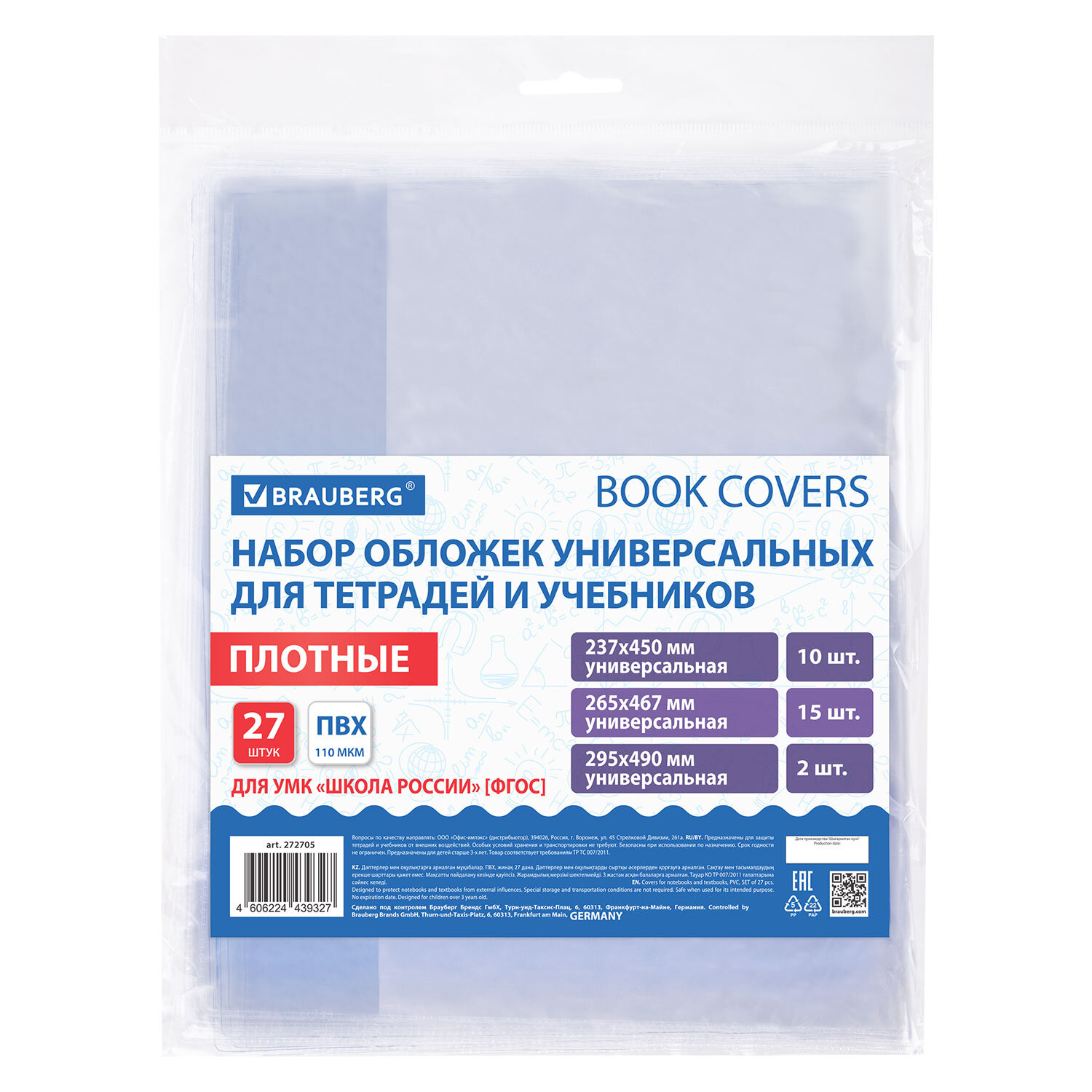 Изготовлены из высококачественного поливинилхлорида (ПВХ) толщиной 110 мкм. Предназначены для учебников и тетрадей. В наборе: 237×450 мм – 10 шт., 265×467 мм – 15 шт., 295×490 мм – 2 шт. Универсальные глянцевые обложки легко регулируются под размер учебника и тетради. Не содержат веществ, вредных для здоровья детей.