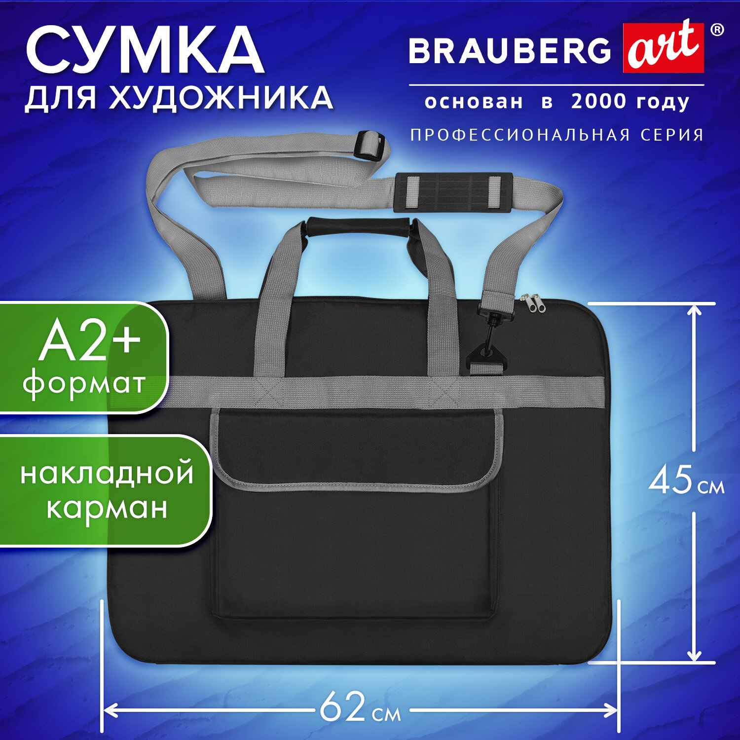Сумка для художника СУПЕР РАЗМЕР А2+ (62 см х 45 см), чёрная, накладной карман, BRAUBERG ART CLASSIC, 272986