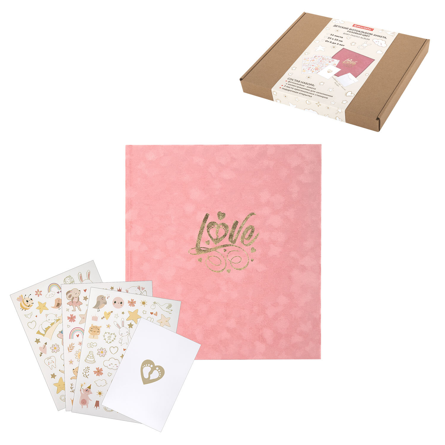 Фотоальбом-анкета детский 23х25 см, 32 листа, стикеры, открытка, конверт, розовый бархат, BRAUBERG, 391419