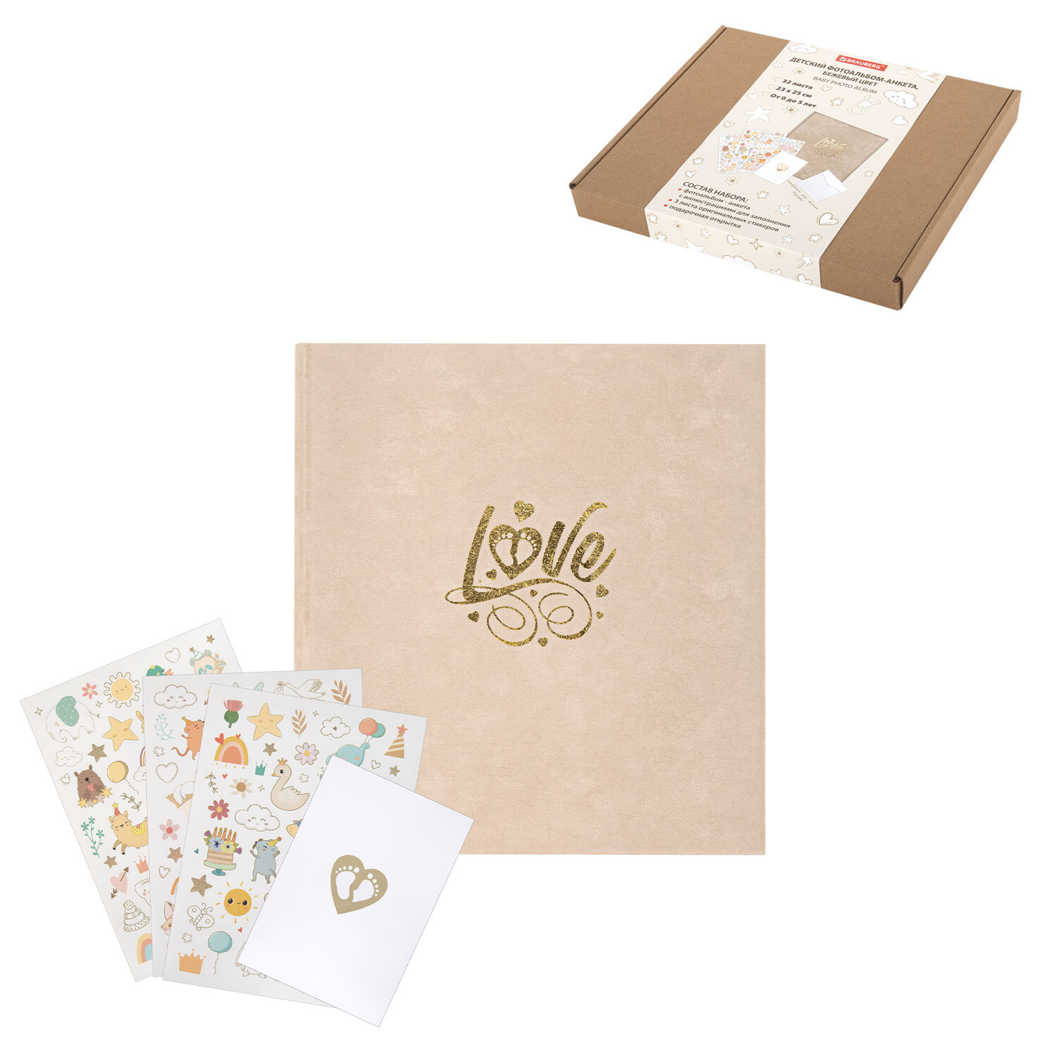 Фотоальбом-анкета детский 23х25 см, 32 листа, стикеры, открытка, конверт, бежевый бархат, BRAUBERG, 391421