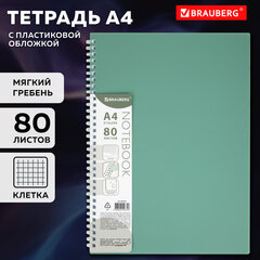 Тетрадь обложка пластик, А4 80 л., гребень мягкий (силиконовый), клетка, BRAUBERG, зеленая, 405355