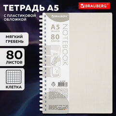 Тетрадь обложка пластик, А5 80 л., гребень мягкий (силиконовый), клетка, BRAUBERG, бежевый, 405358