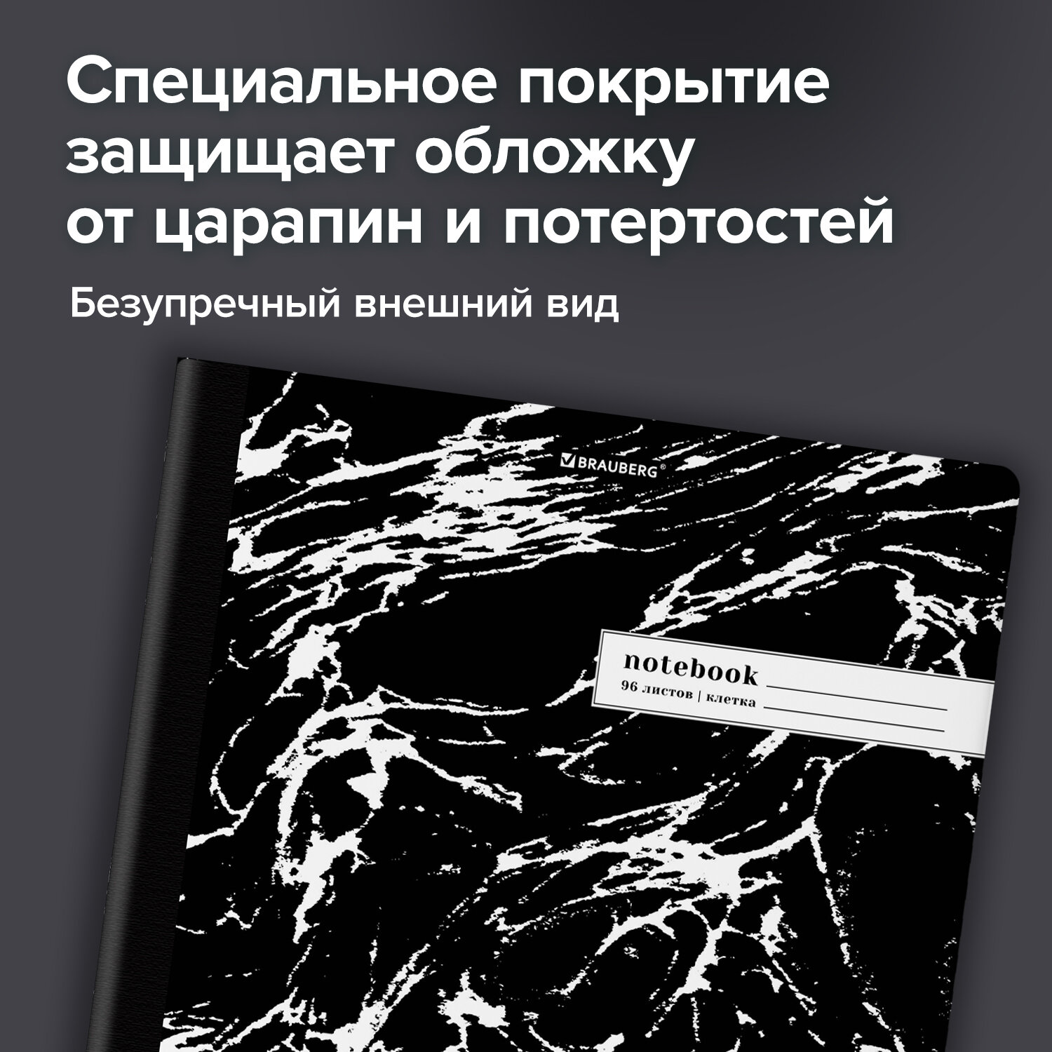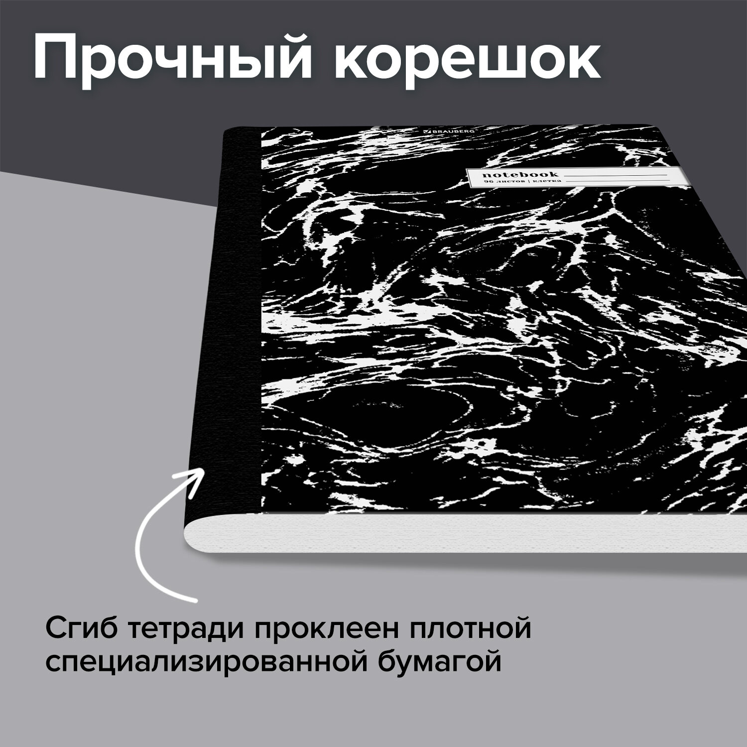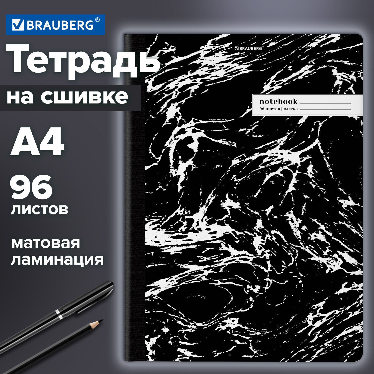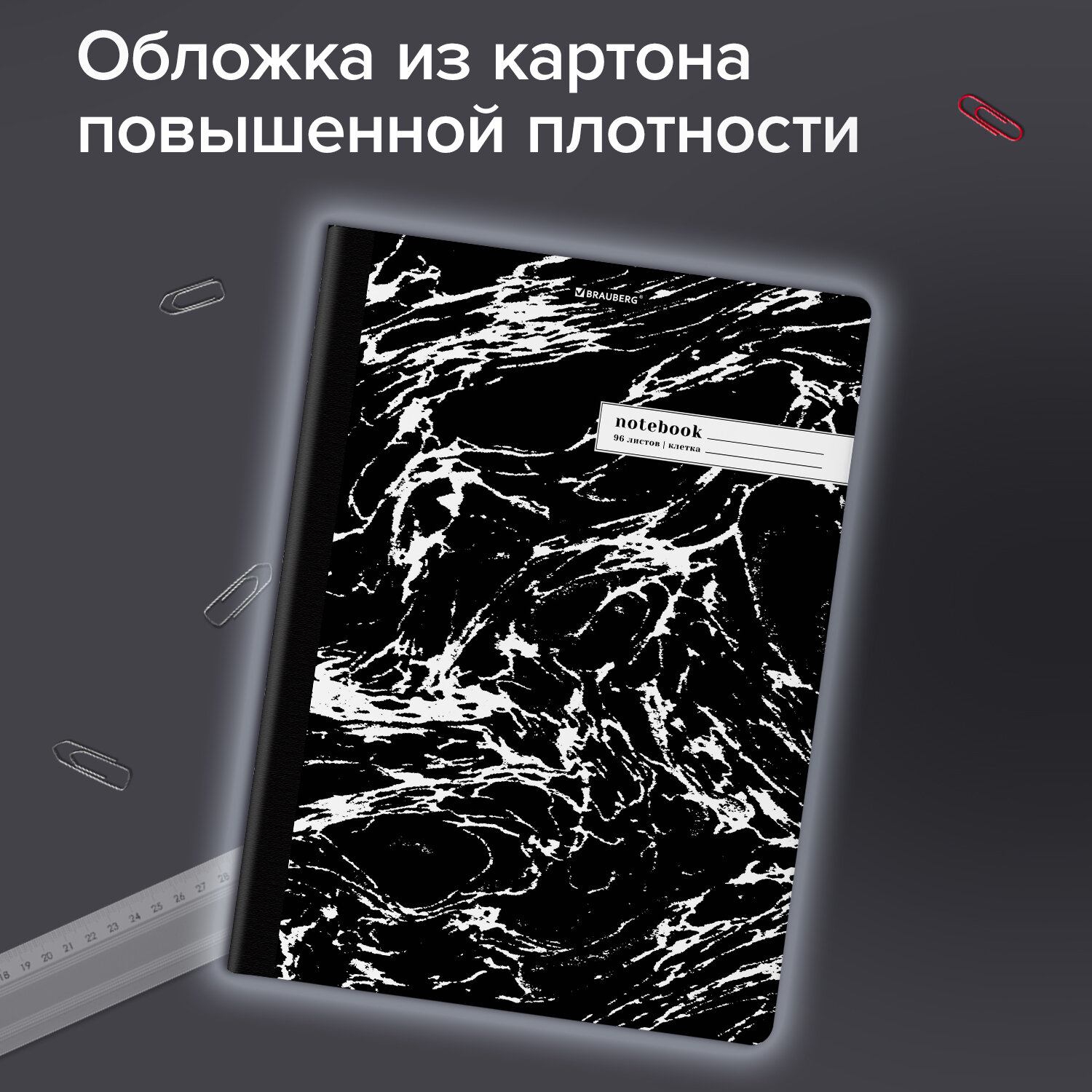 Внутренний блок содержит 96 листов офсетной бумаги плотностью 60 г/м2. Обложка изготовлена из мелованного картона повышенной плотности 300 г/м2 со специальной матовой ламинацией, устойчивой к царапинам и потертостям. Линовка блока – клетка с полями, выполненная в сером цвете для комфортного письма. Сшивка надежно соединяет листы между собой. Корешок тетради проклеен плотным материалом, дополняющим дизайн. Белизна блока – 100%. Формат листов – А4.