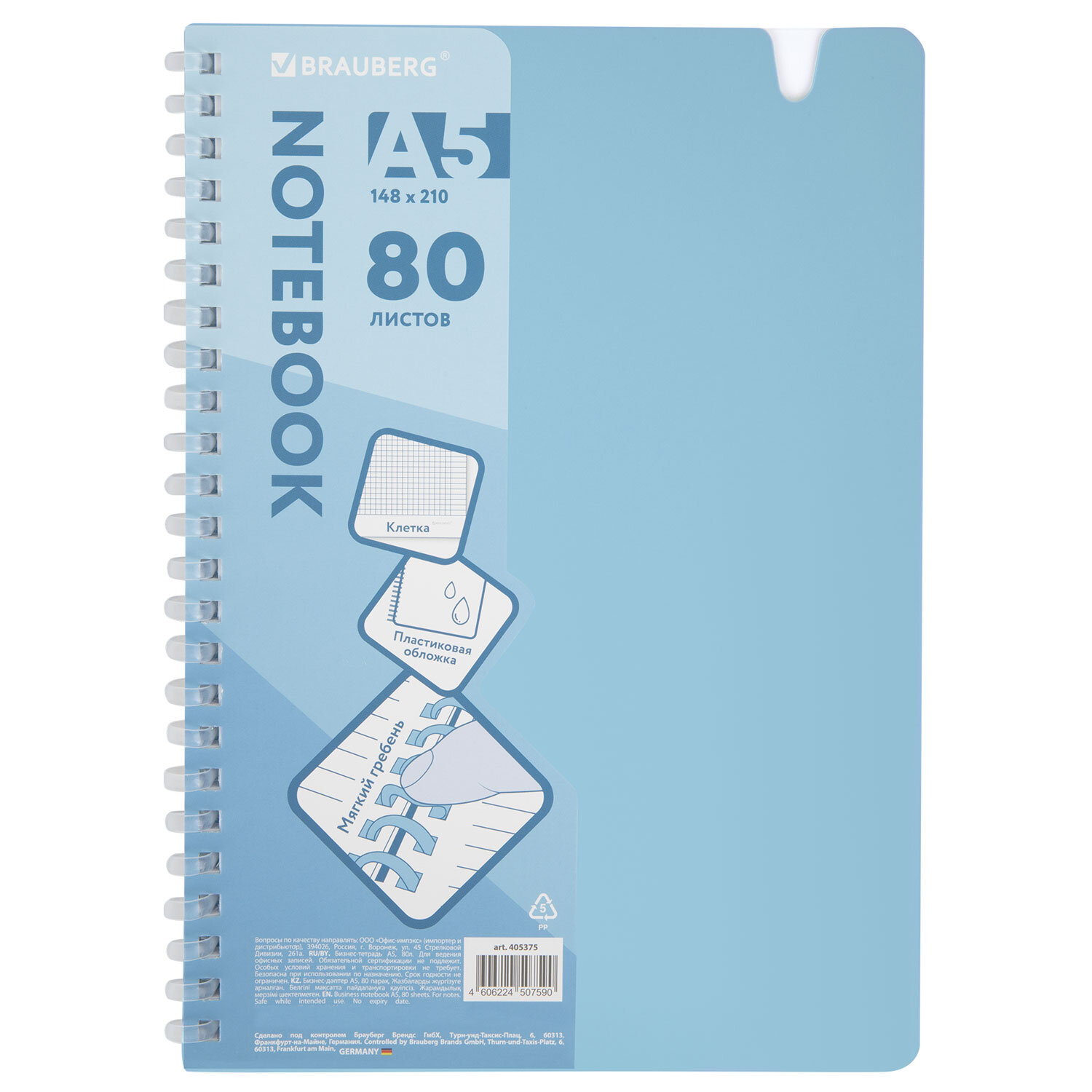 Тетрадь обложка пластик, А5 80 л., гребень мягкий, вырубка для ручки, клетка, BRAUBERG, голубой, 405375