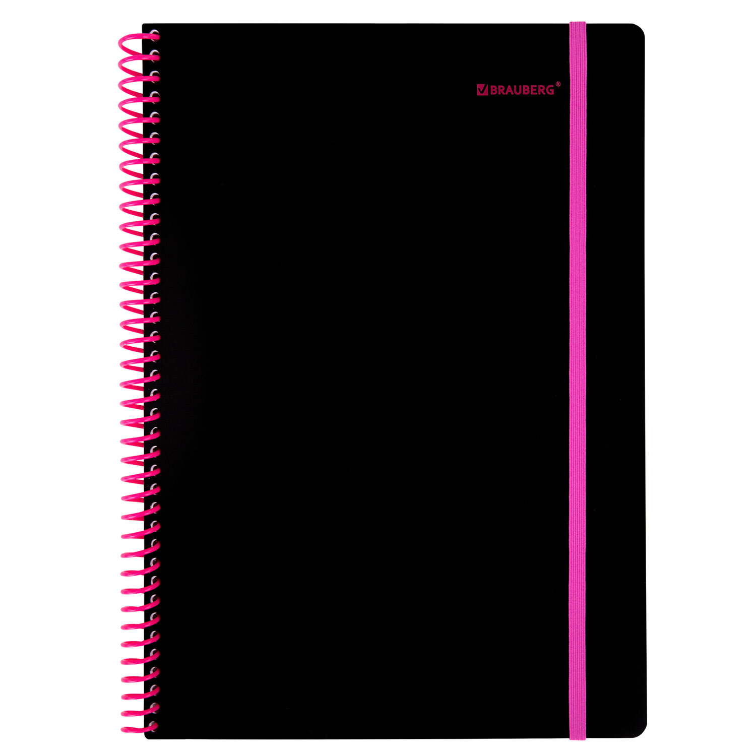 Тетрадь обложка пластик, А4 80 л., спираль пластик, резинка, клетка, BRAUBERG, черный/розовый, 405380