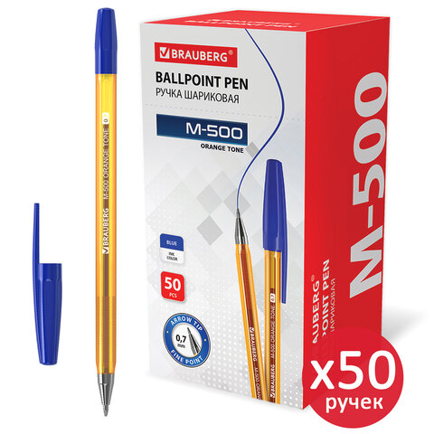 Ручка шариковая M-500 AMBER, синяя, ВЫГОДНАЯ УПАКОВКА, КОМПЛЕКТ 50 штук, 0,35 мм, BRAUBERG, 880395