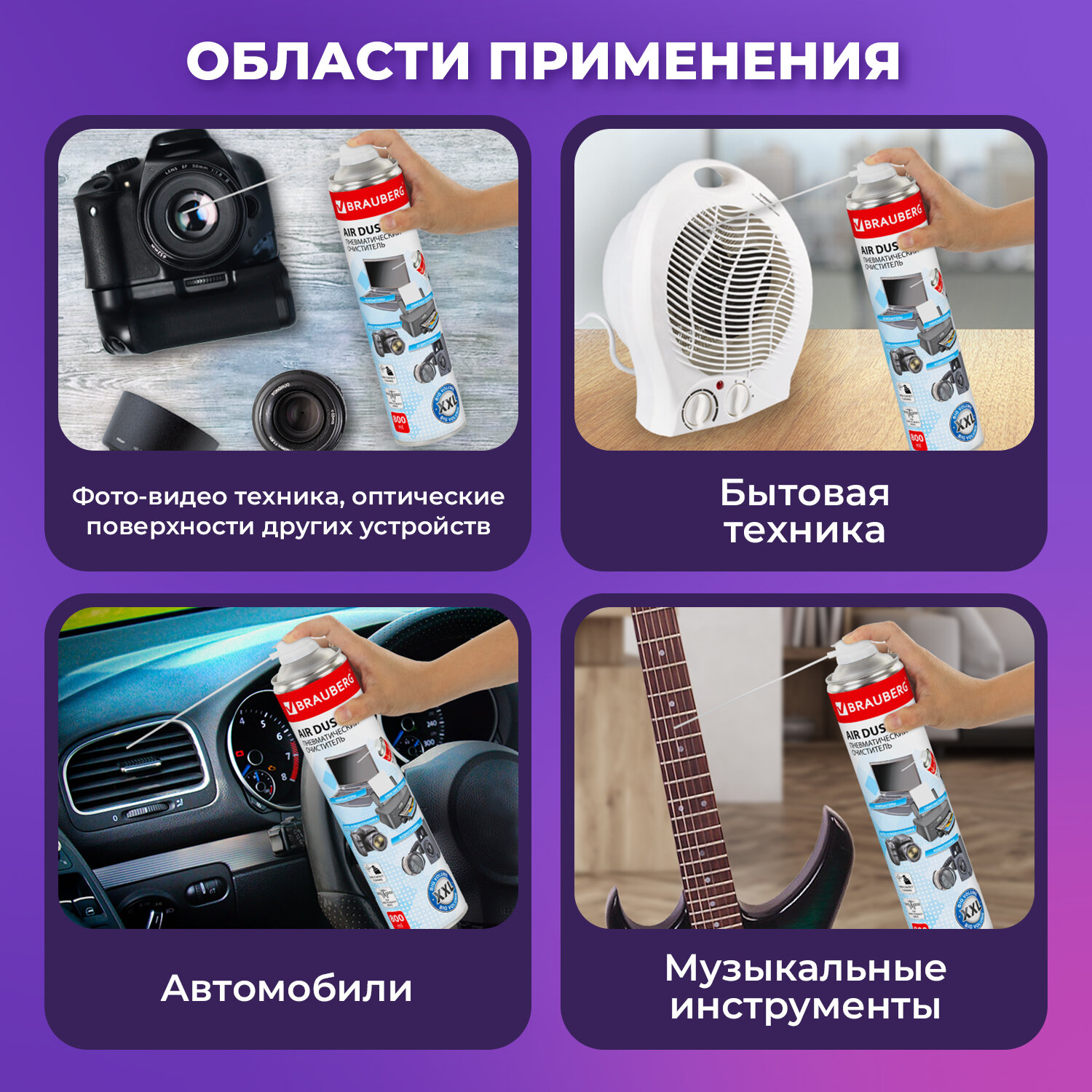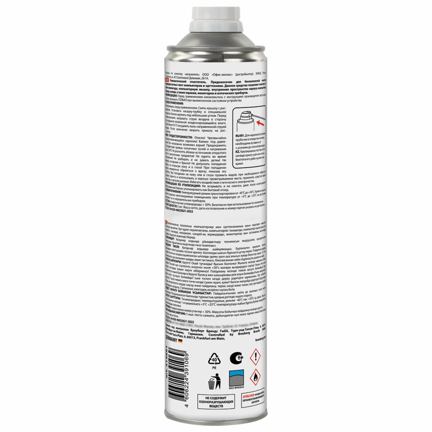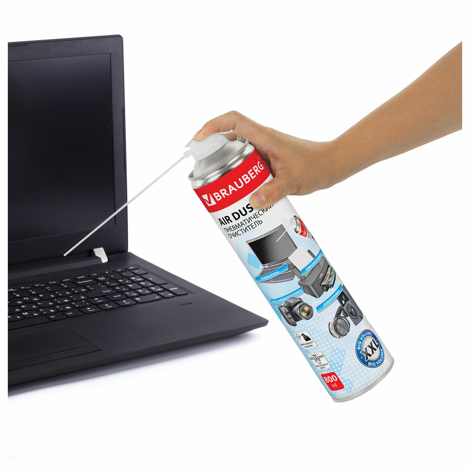 Баллон со сжатым воздухом BRAUBERG предназначен для бесконтактного удаления пыли и мелкого мусора из труднодоступных мест и внутреннего пространства компьютерной техники, аудио-, видео- и фотоаппаратуры, офисной и бытовой техники.