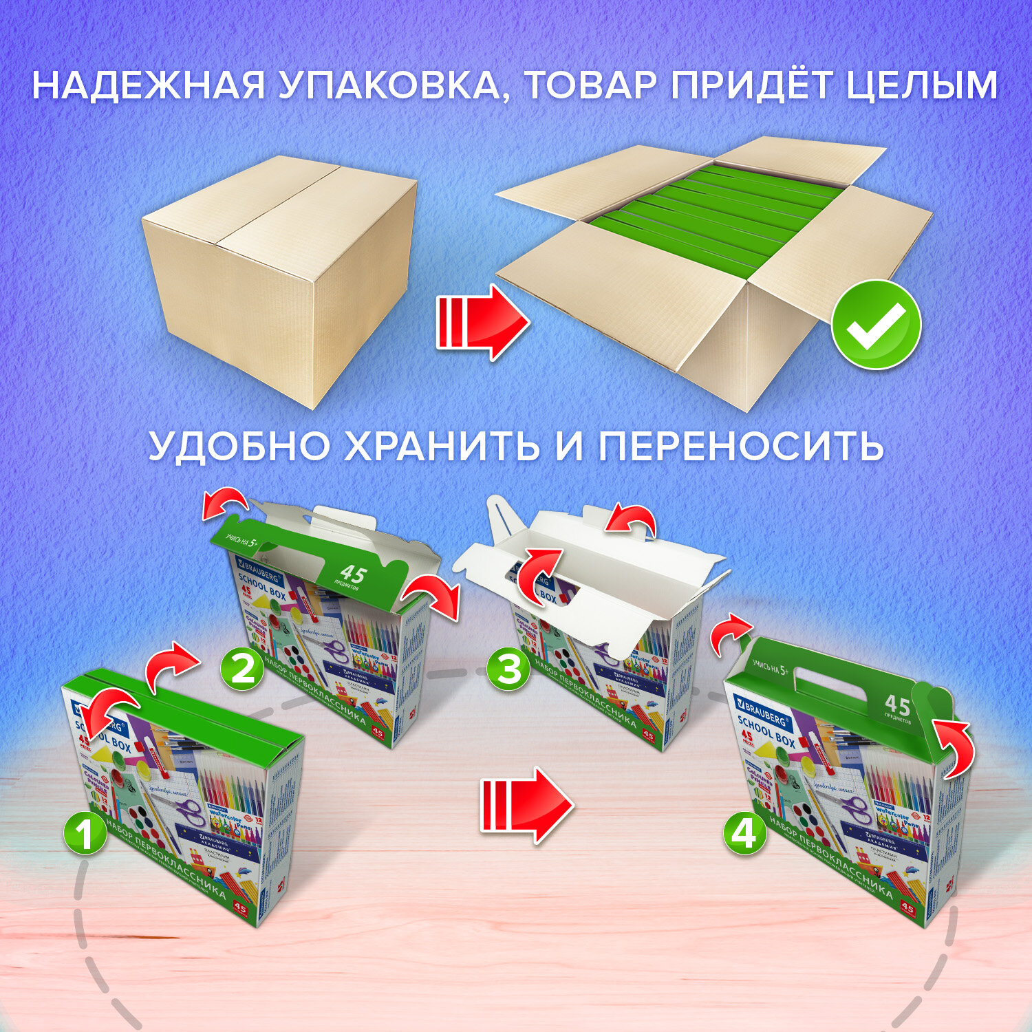 В состав набора входят только высококачественные сертифицированные отечественные и импортные школьные принадлежности, соответствующие требованиям безопасности детских товаров законодательства РФ.