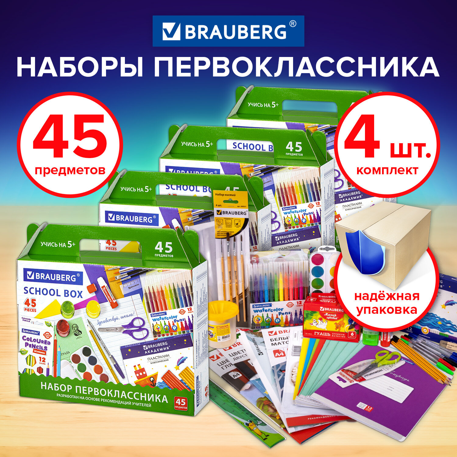 Набор школьных принадлежностей в подарочной коробке BRAUBERG "НАБОР ПЕРВОКЛАССНИКА", 45 предметов, КОМПЛЕКТ 4 шт., 880804