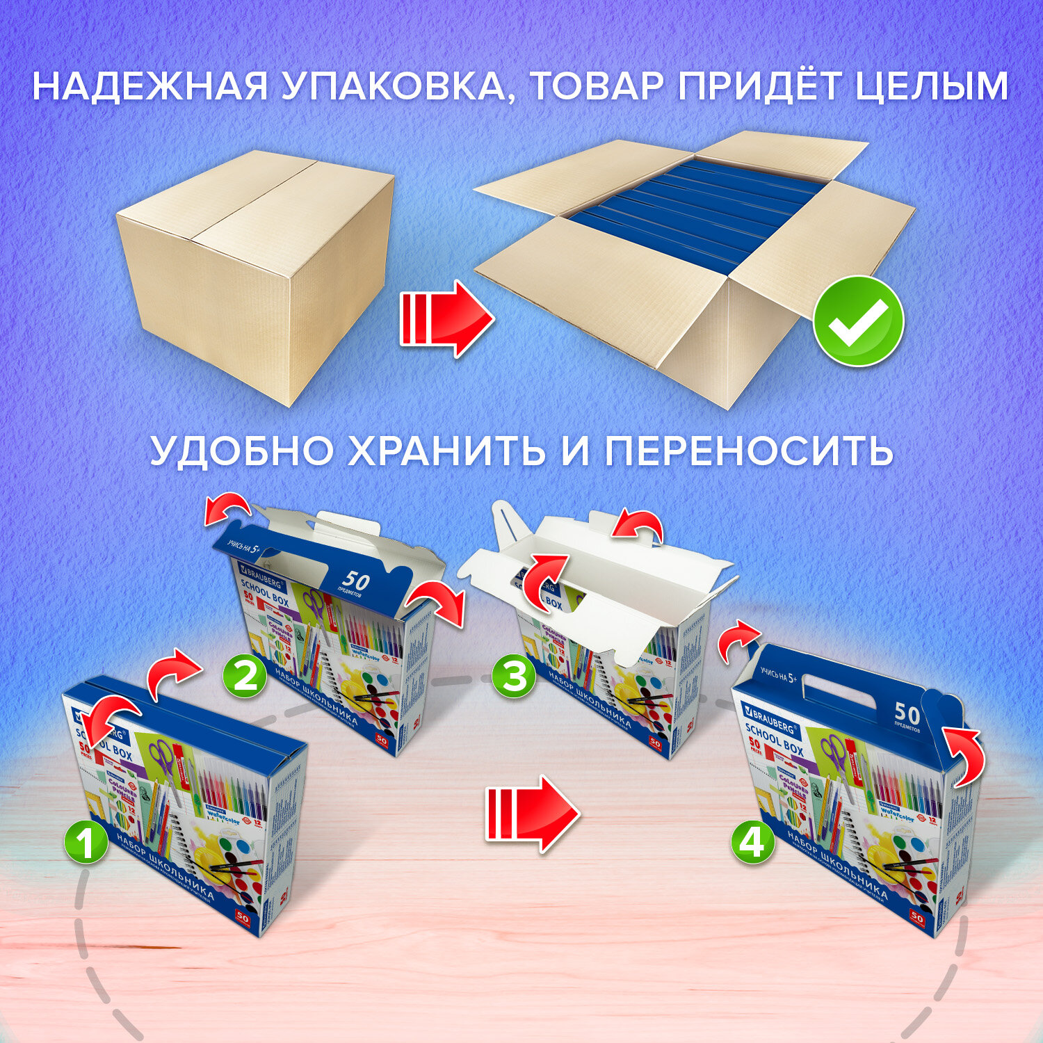 Комплект представляет собой прочный гофрокороб, внутри которого находится 4 подарочных коробки-чемоданчика из плотного картона с красочным дизайном и наполнением.