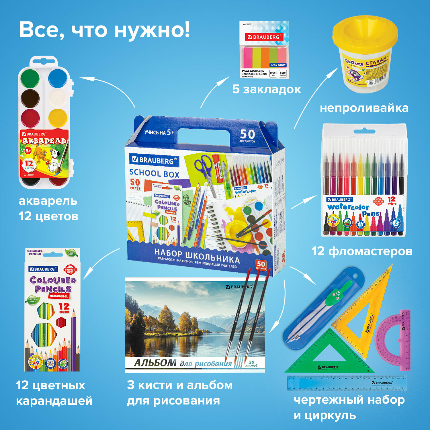 Состав набора разработан на основе рекомендаций учителей и пожеланий родителей таким образом, чтобы обеспечить школьника всем необходимым.