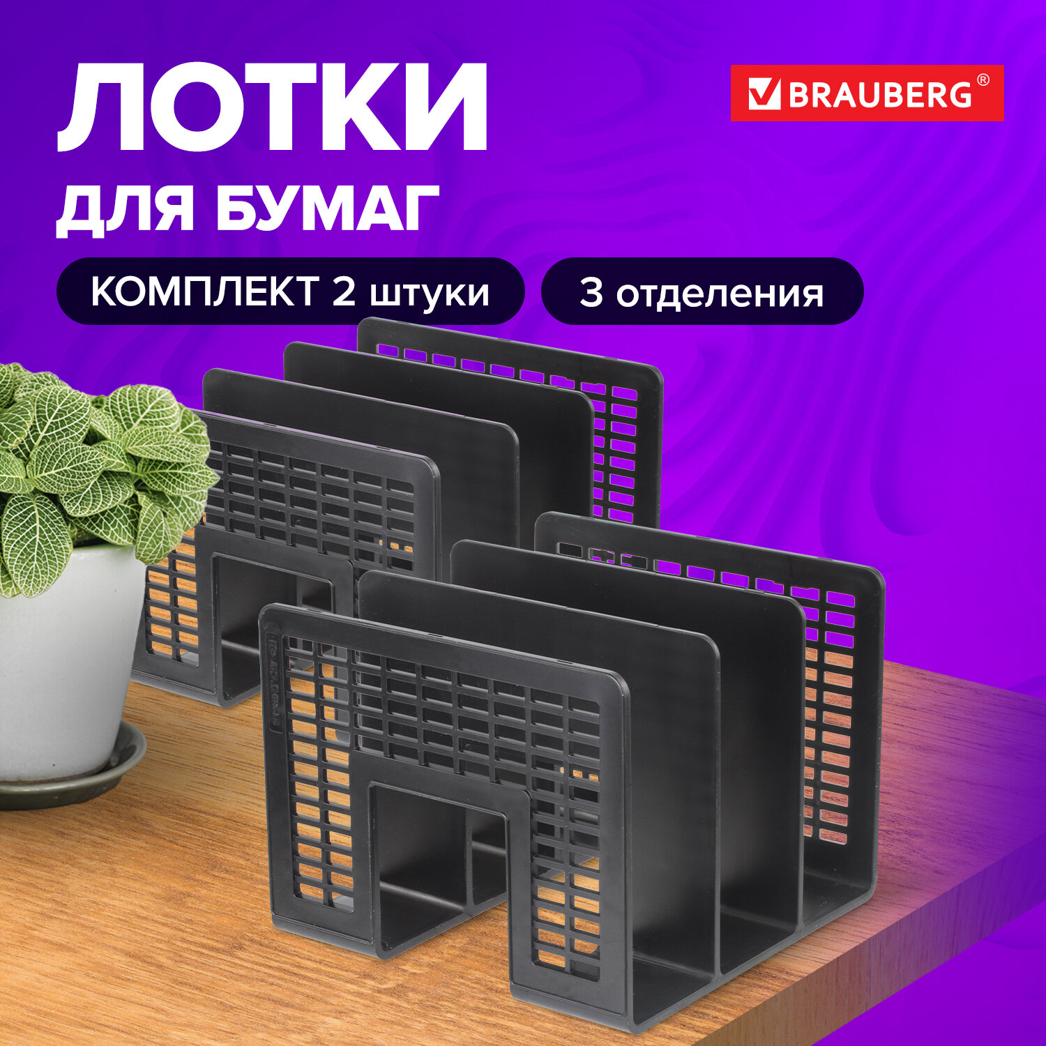 Лоток-сортер для бумаг КОМЛЕКТ 2 шт. BRAUBERG "Radikal", 3 отделения, черный, 880807