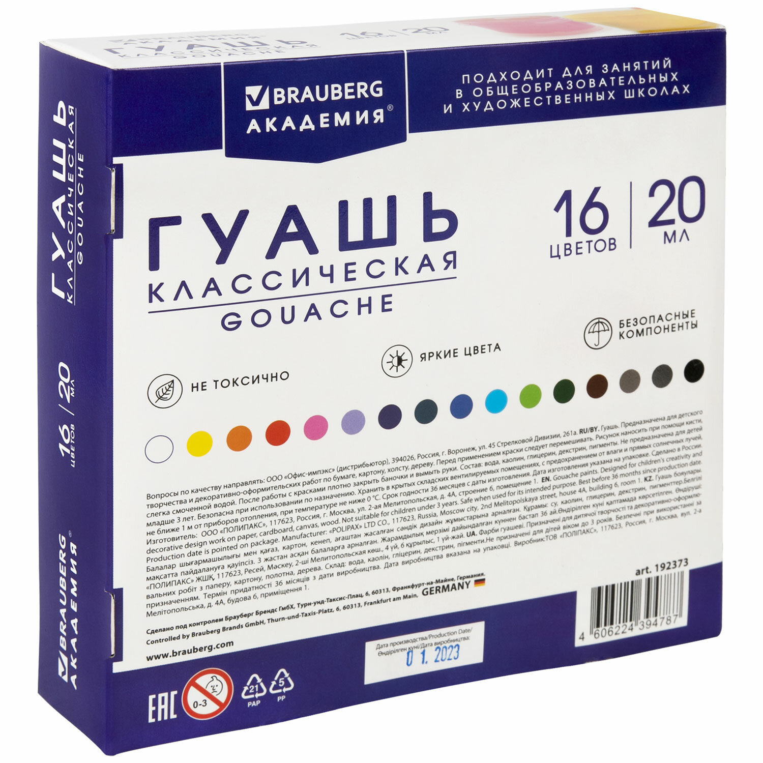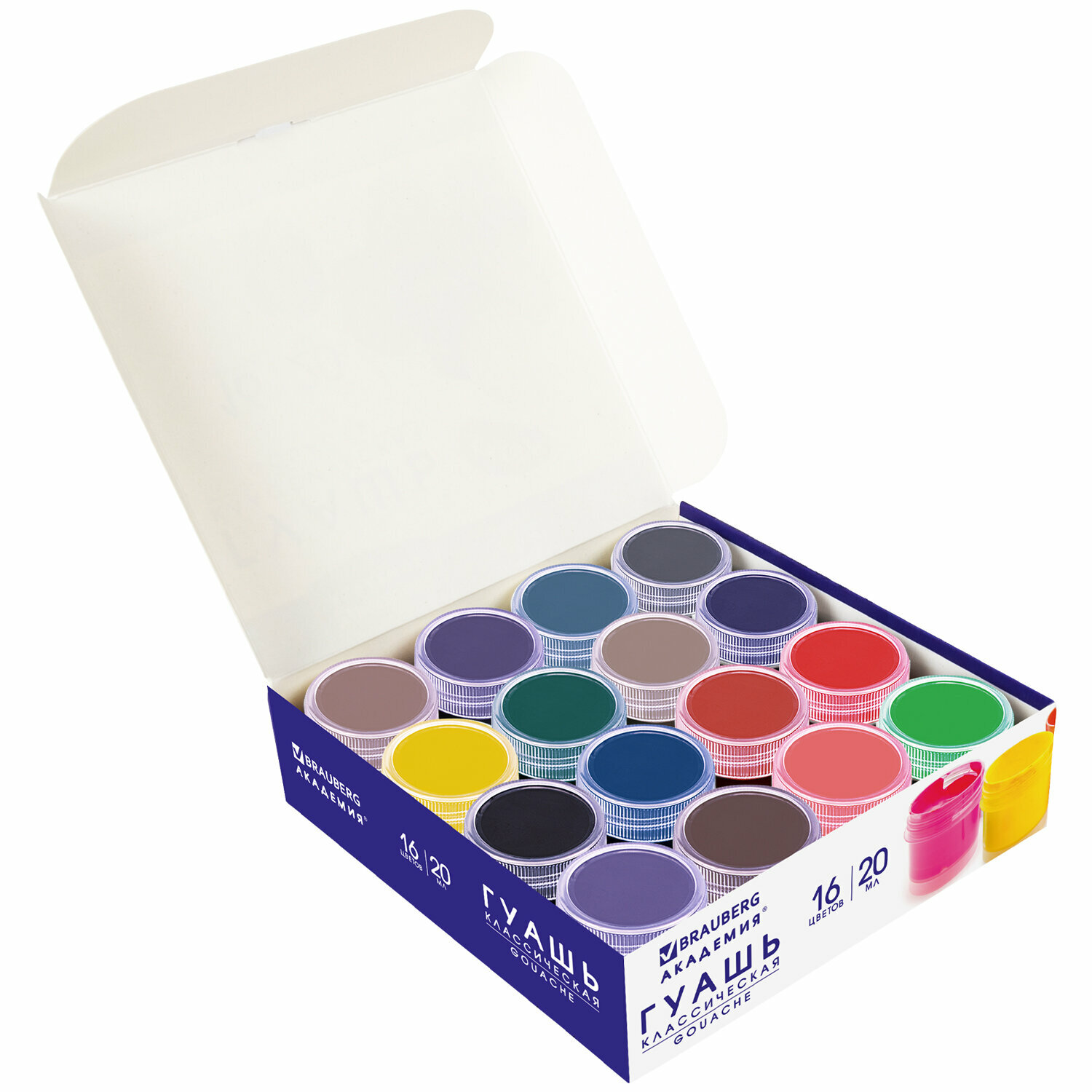 Краски полностью безопасны в использовании, не токсичны, без резкого запаха. Гуашь обладает высокой светостойкостью и укрывистостью, легко смешивается и размывается водой, хорошо наносится, без труда удаляется с рук и одежды. Краски разлиты в пластмассовые герметичные баночки объемом 20 мл. Общий объем – 320 мл.