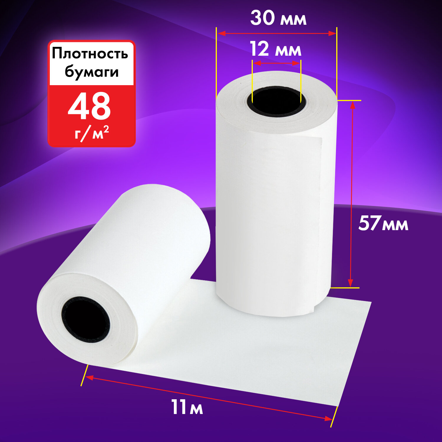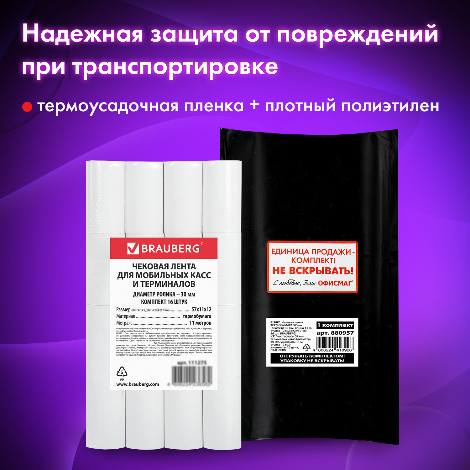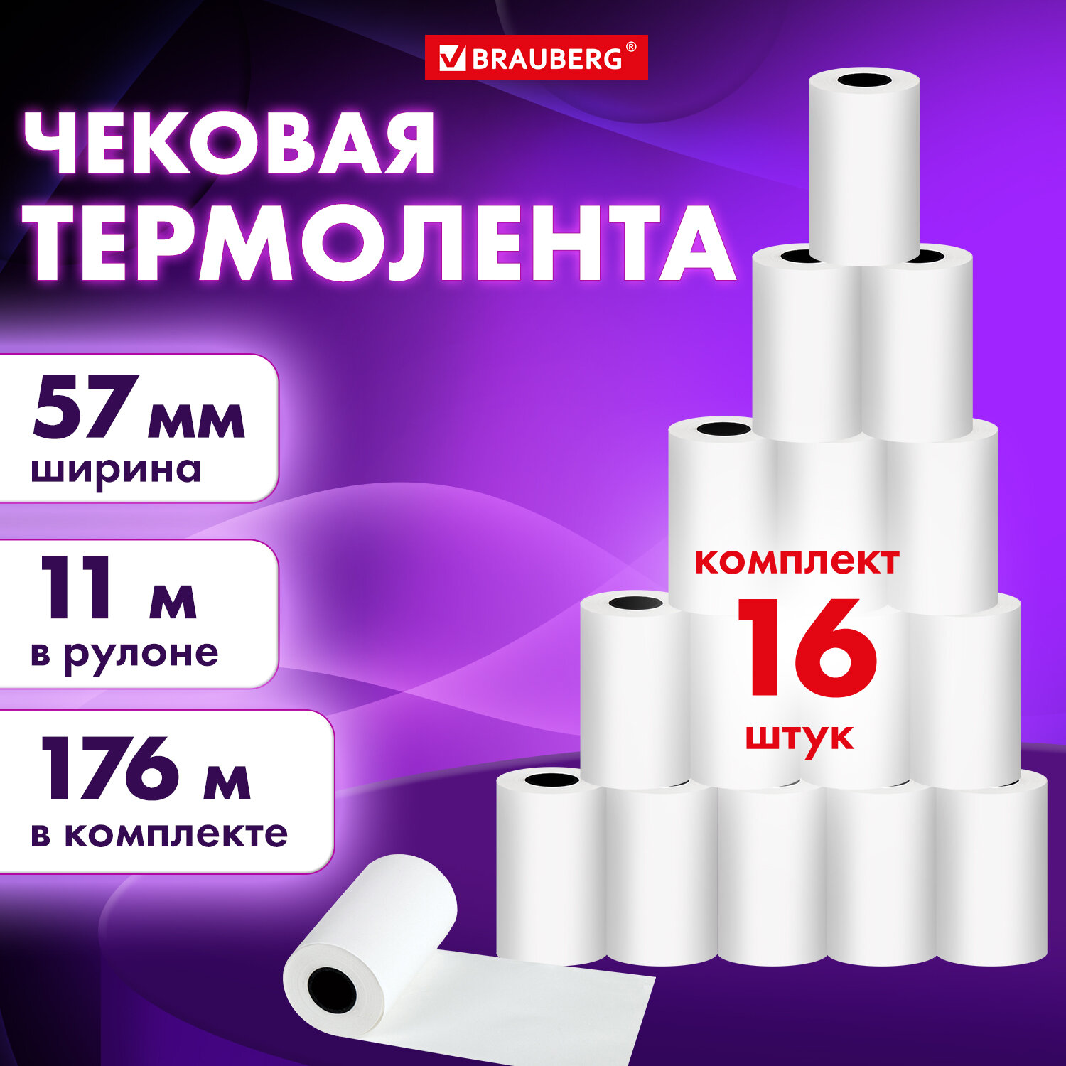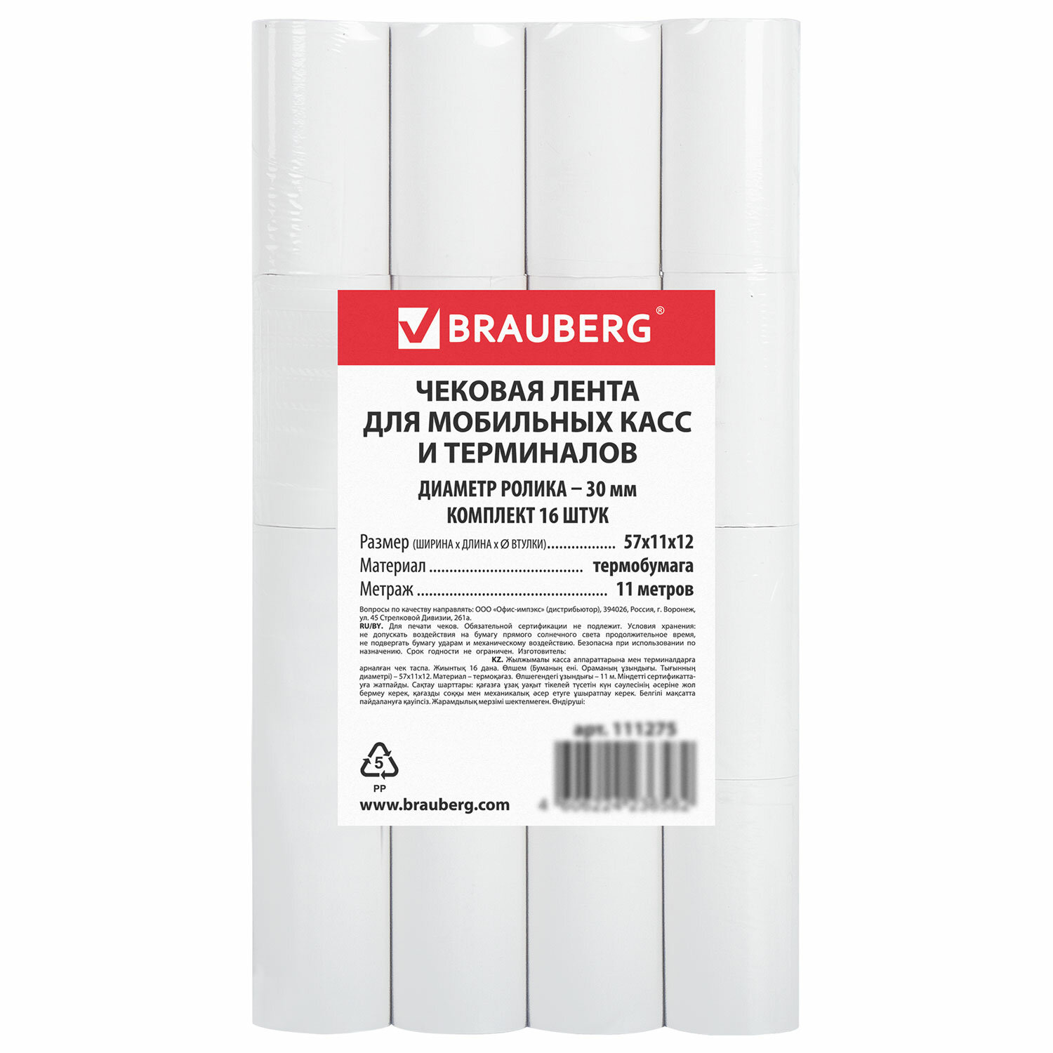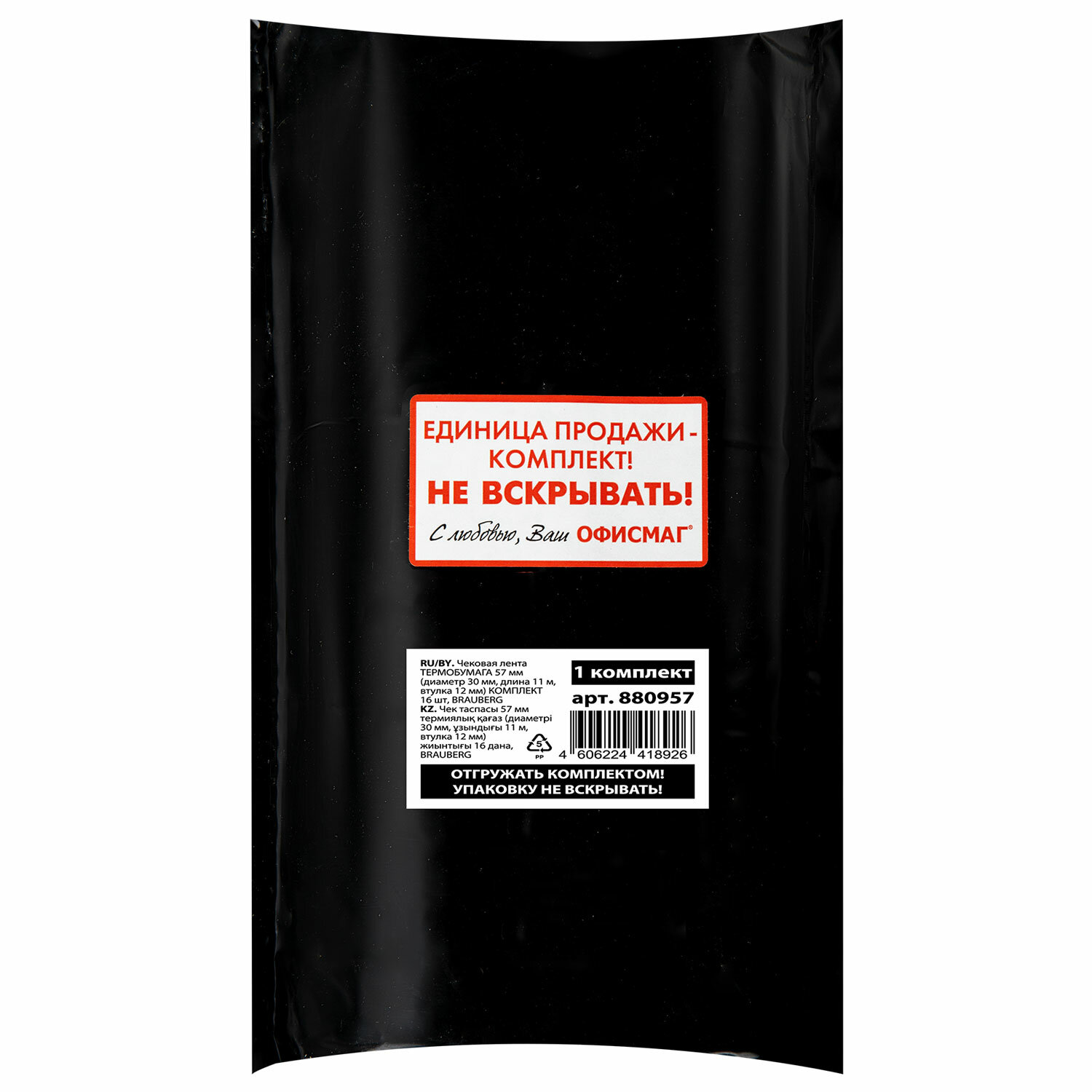 Чековая лента ТЕРМОБУМАГА 57 мм (диаметр 30 мм, длина 11 м, втулка 12 мм), КОМПЛЕКТ 16 шт., BRAUBERG, 880957