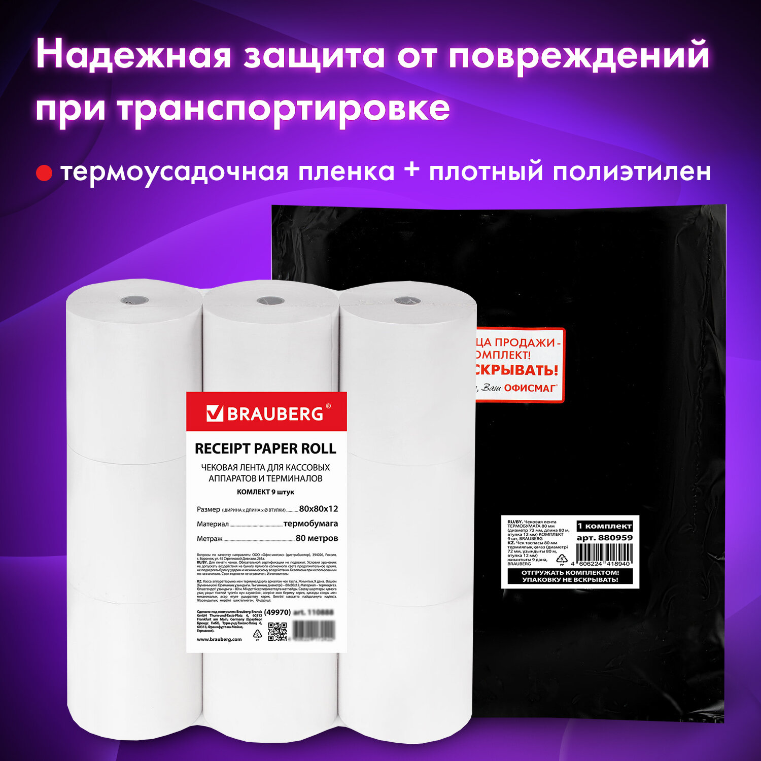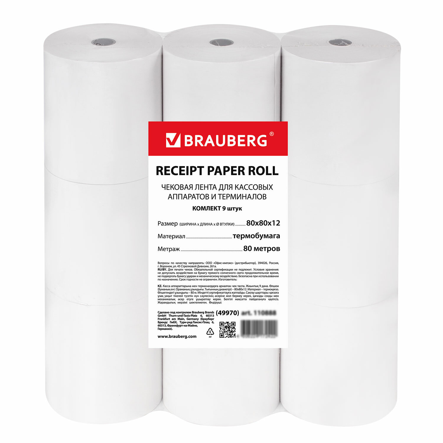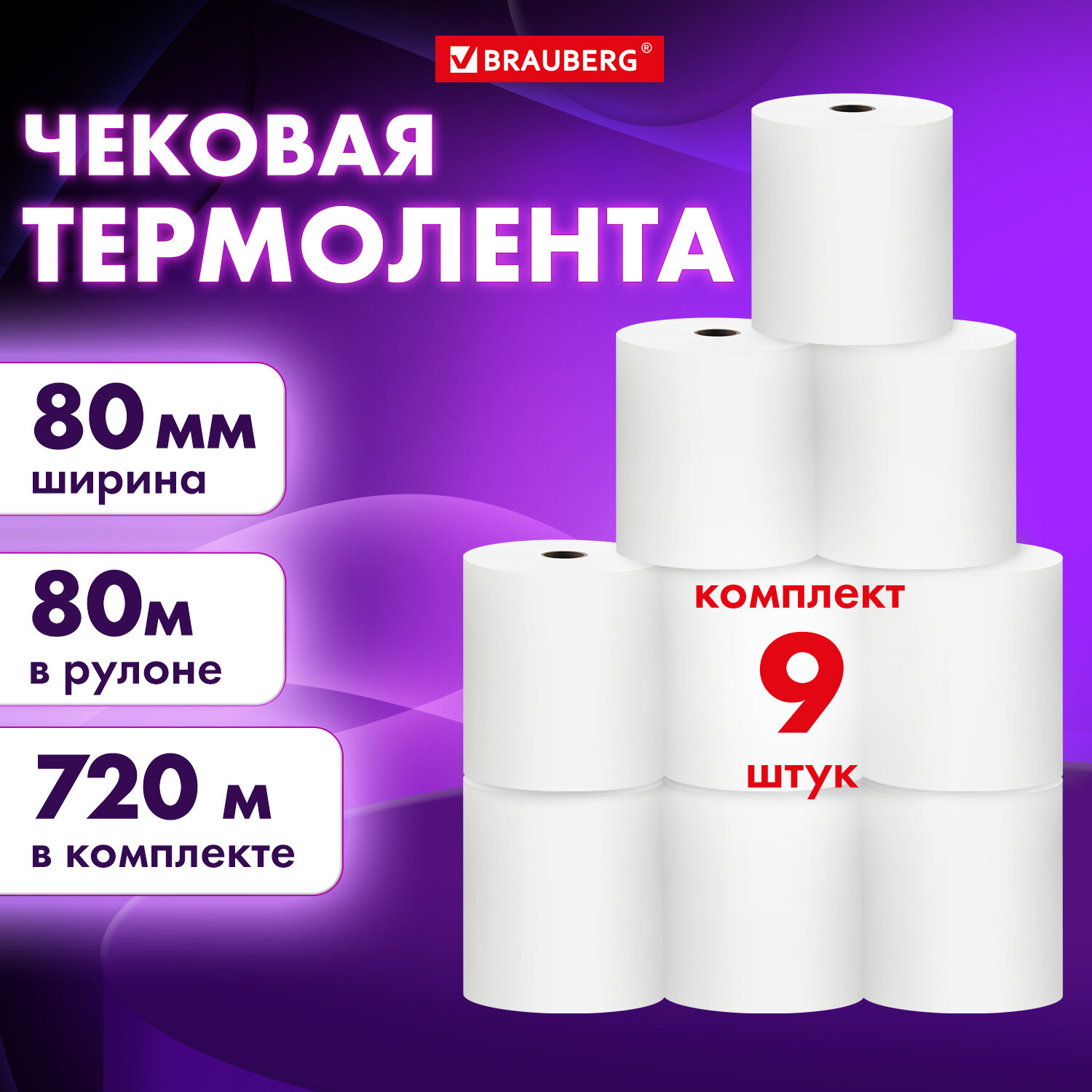 Чековая лента ТЕРМОБУМАГА 80 мм (диаметр 72 мм, длина 80 м, втулка 12 мм), КОМПЛЕКТ 9 шт., BRAUBERG, 880959