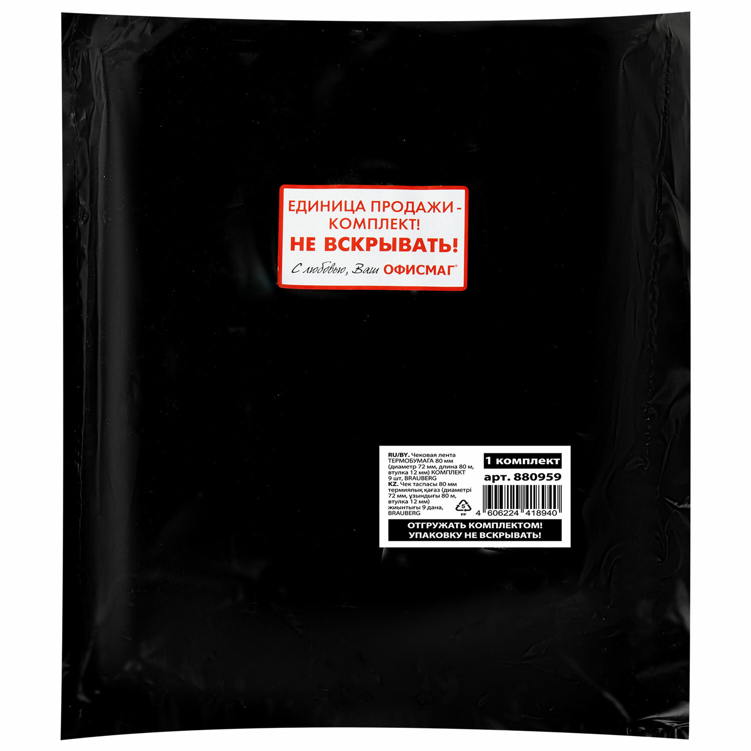 Чековая лента с наружным термослоем имеет ширину 80 мм и общую длину 80 м. Диаметр рулона — 72 мм, диаметр втулки — 12 мм. Плотность бумаги чековой ленты — 48 г/м2. Поставляется в термоусадочной пленке. 9 штук в комплекте.