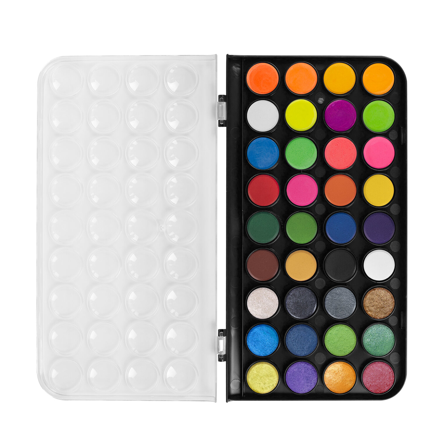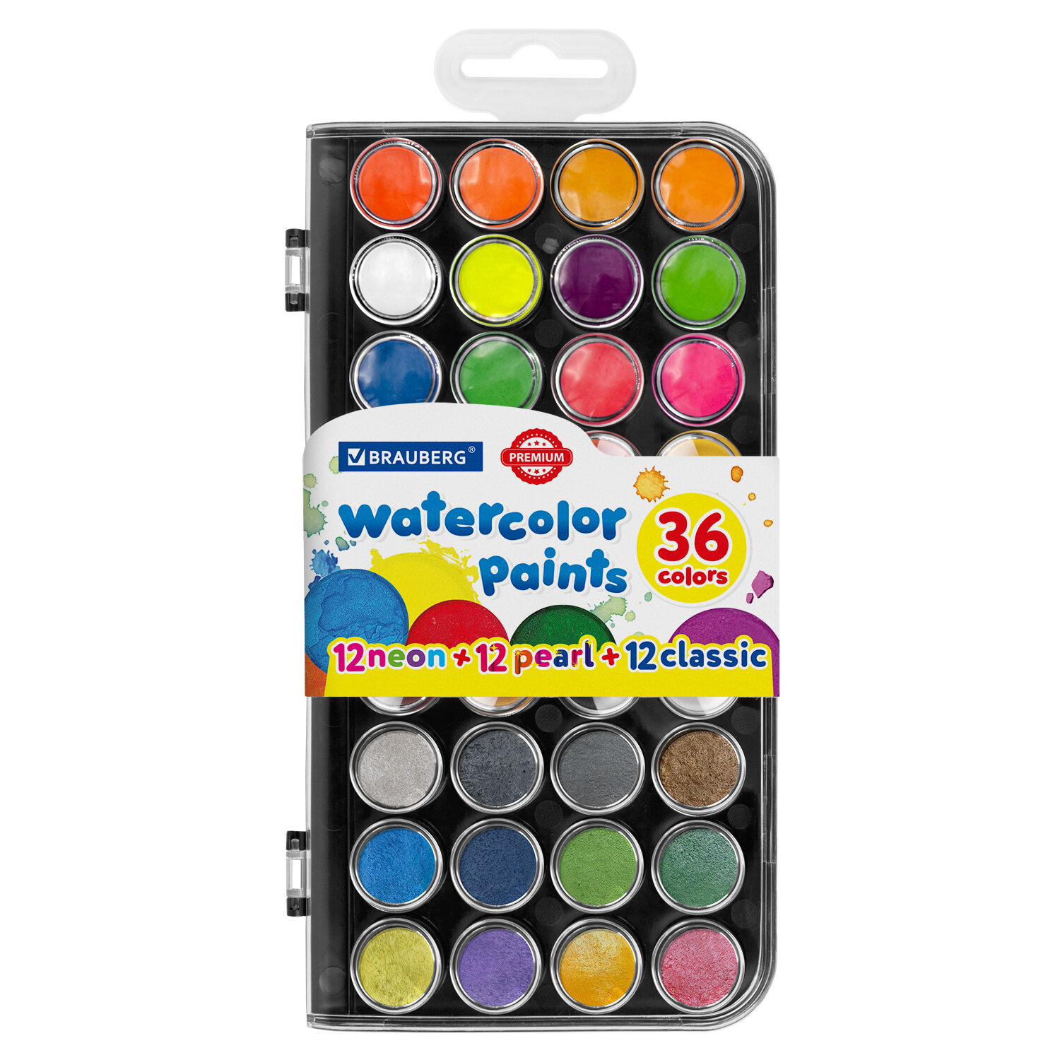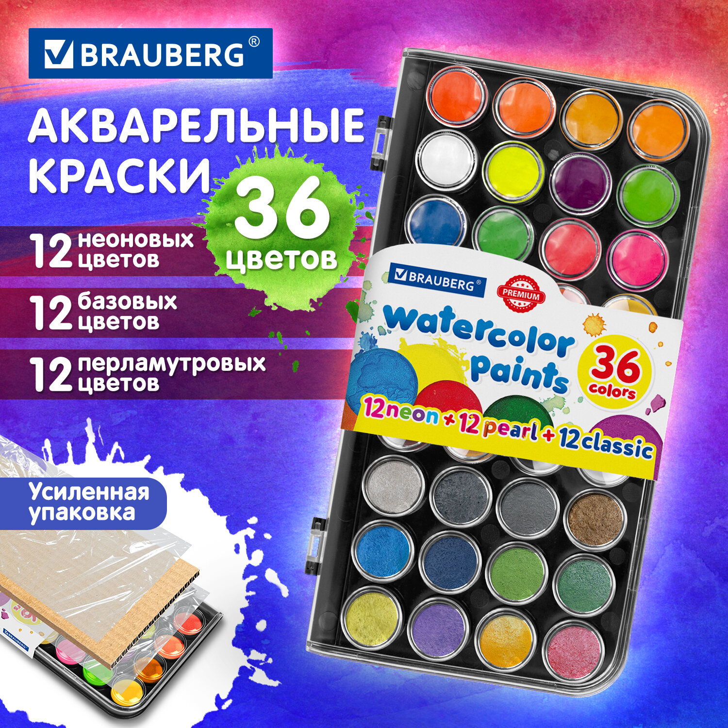Краски акварельные BRAUBERG «PREMIUM» 36 цветов (12 базовых + 12 неоновых + 12 металлик) пенал, 191807