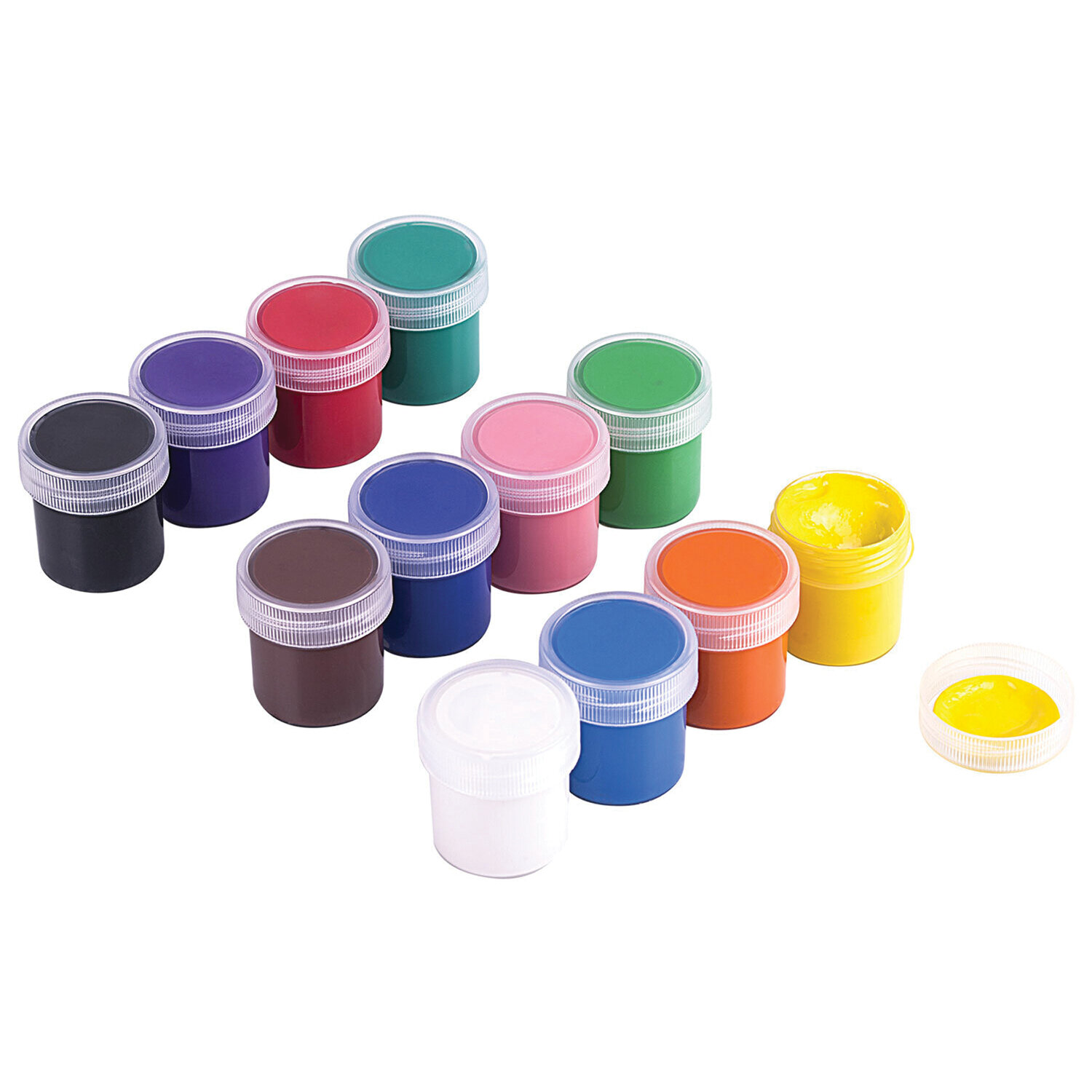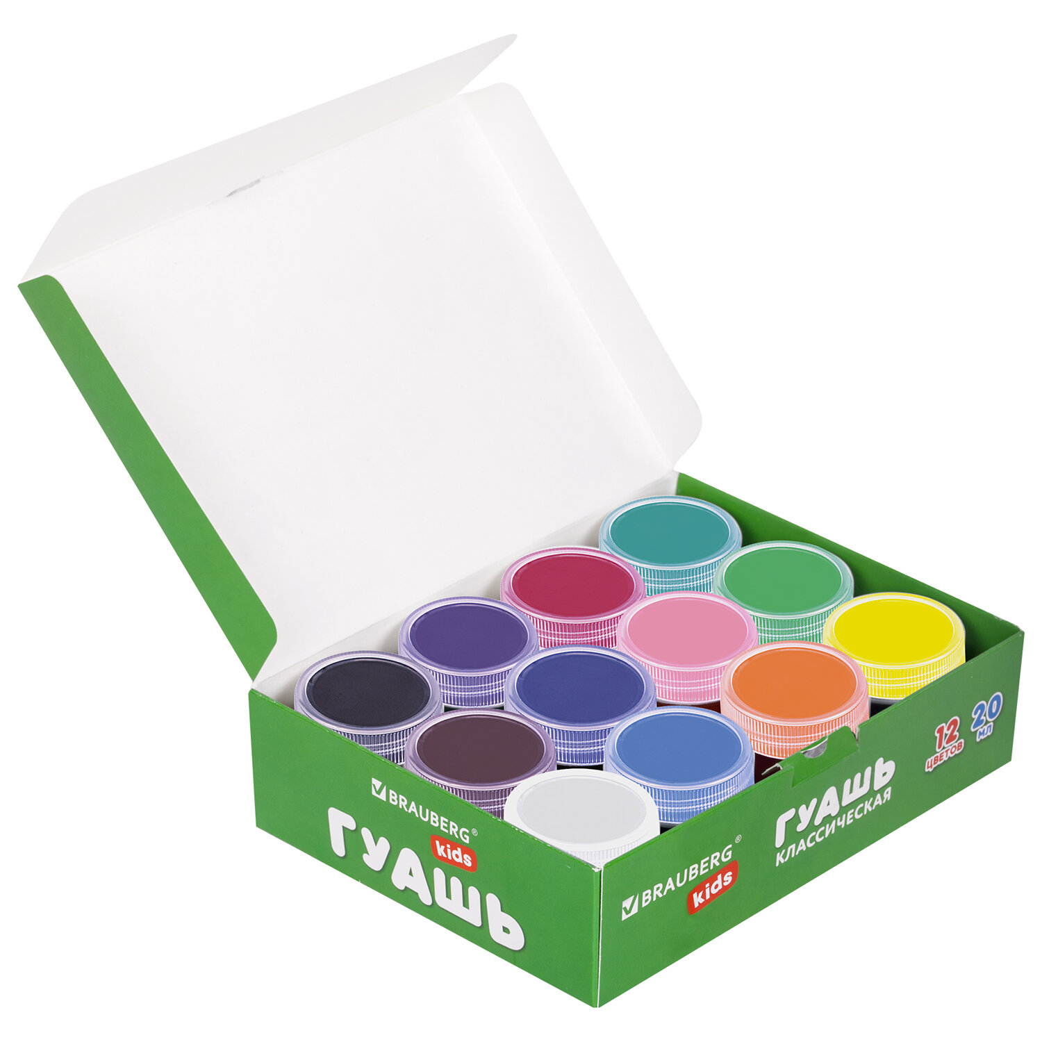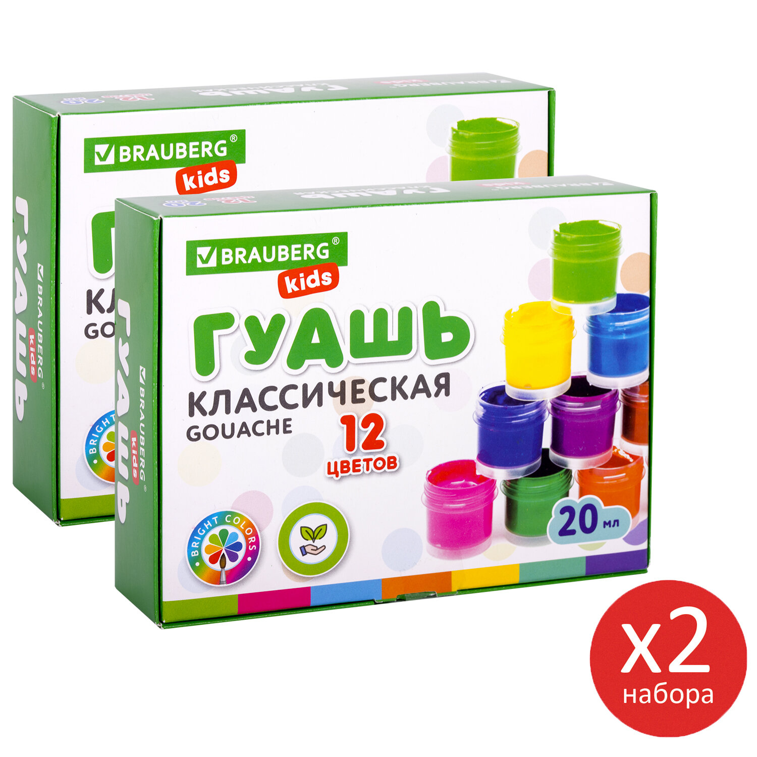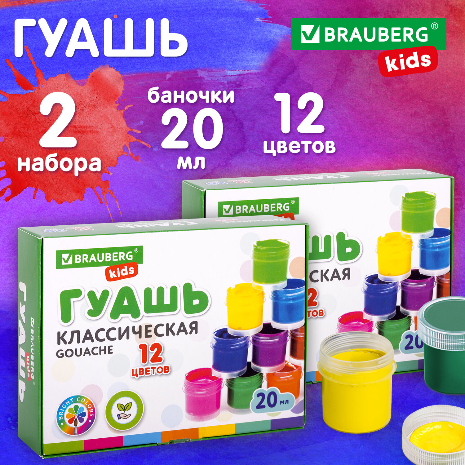 Краски полностью безопасны в использовании, не токсичны, без резкого запаха. Гуашь обладает высокой светостойкостью и укрывистостью, легко cмешивается и размывается водой, хорошо наносится, без труда удаляется с рук и одежды. Краски разлиты в пластмассовые герметичные баночки объемом 20 мл. Общий объем баночек в двух упаковках – 480 мл.
