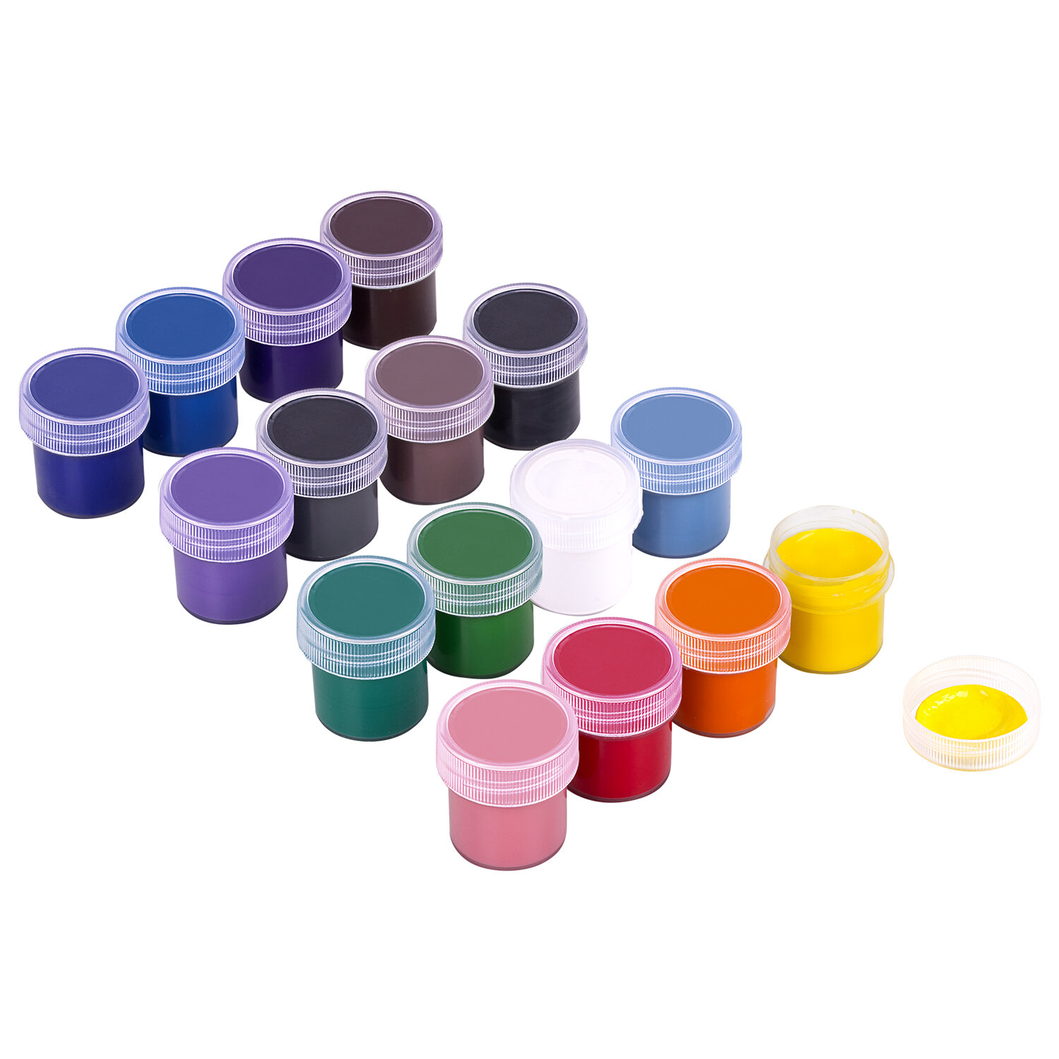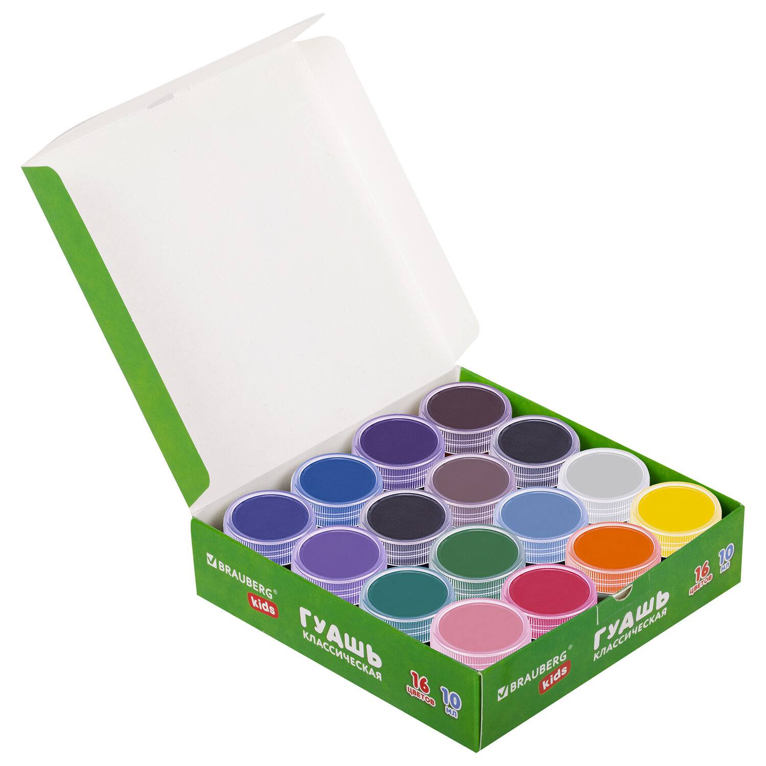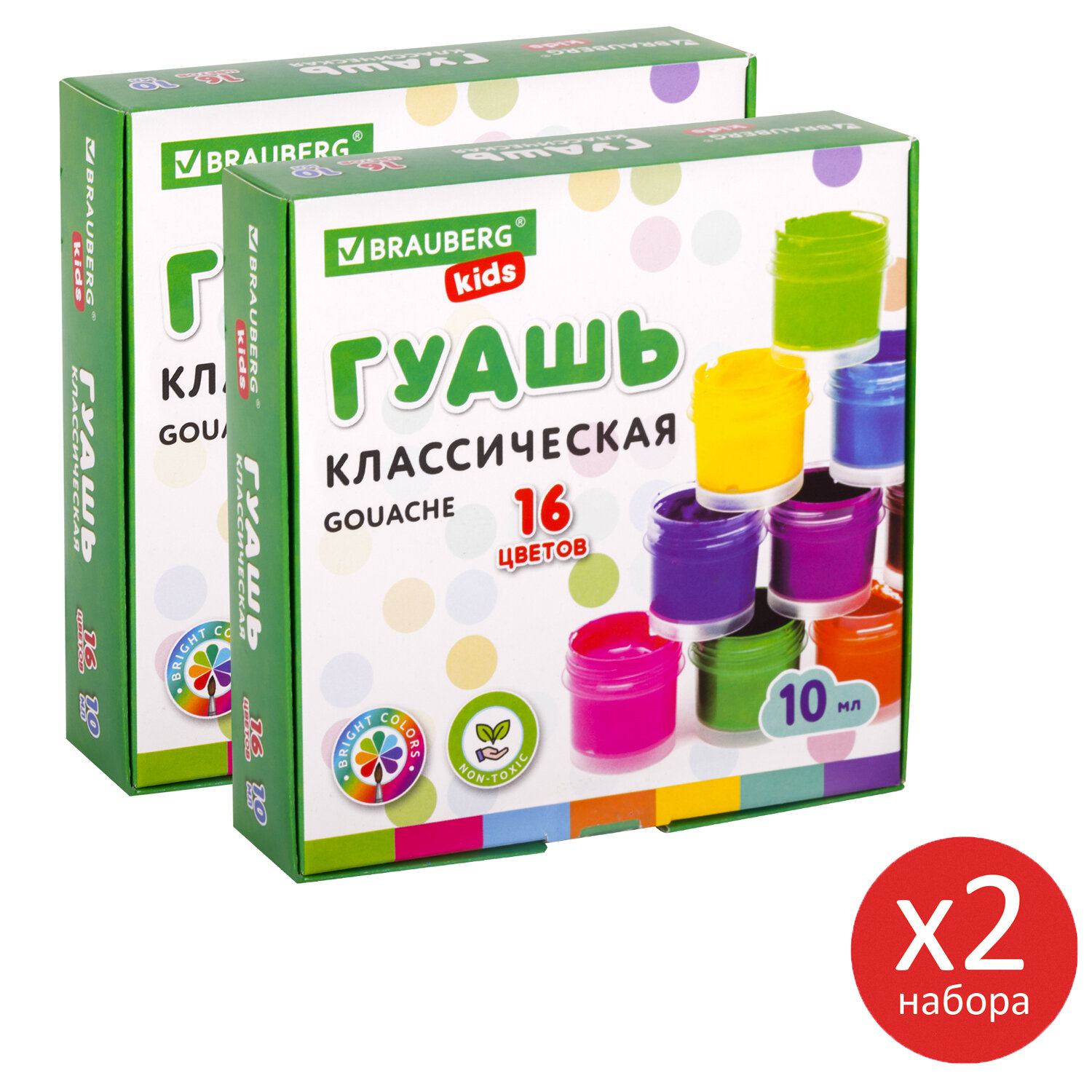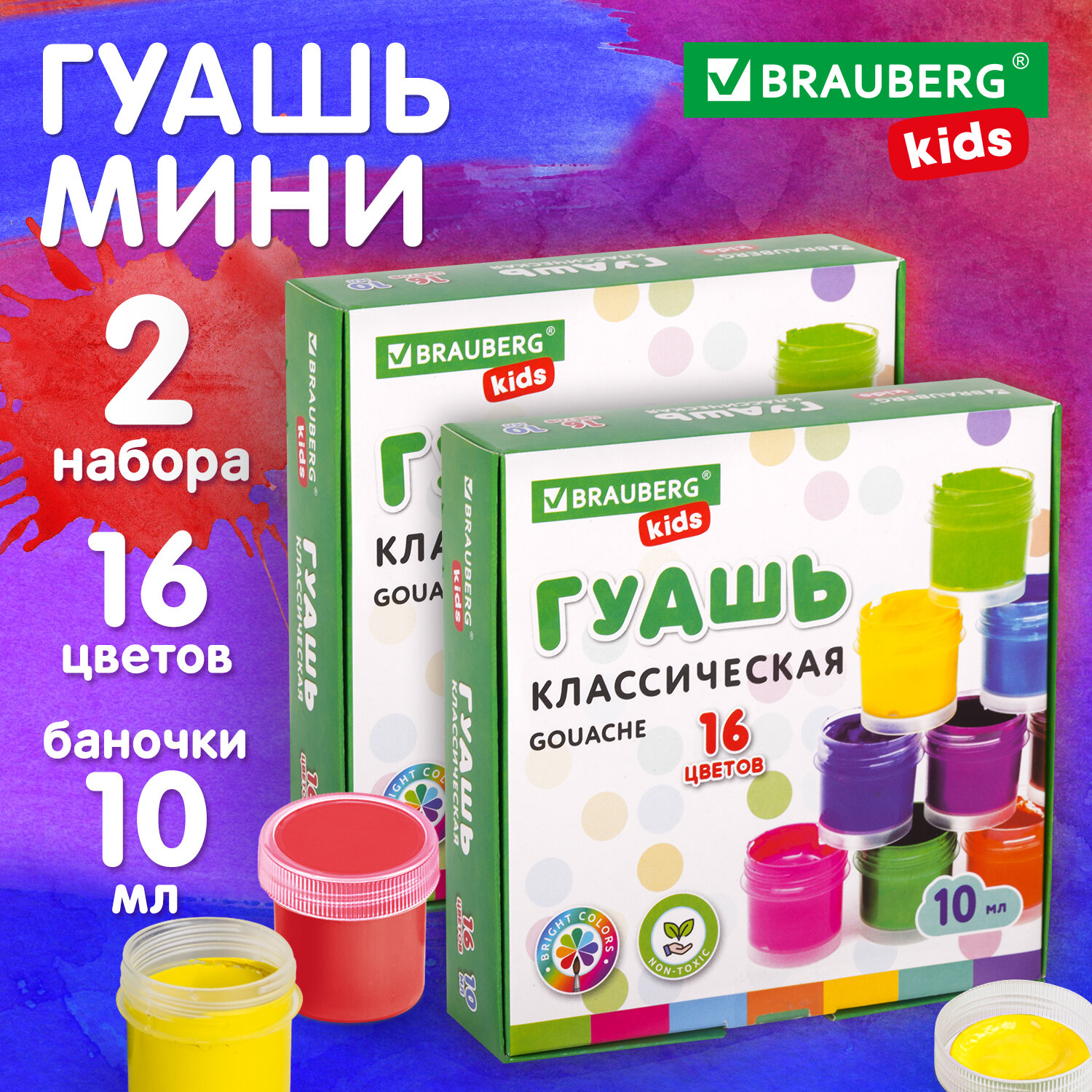 Краски полностью безопасны в использовании, не токсичны, без резкого запаха. Гуашь обладает высокой светостойкостью и укрывистостью, легко cмешивается и размывается водой, хорошо наносится, без труда удаляется с рук и одежды. Краски разлиты в пластмассовые герметичные баночки объемом 10 мл. Общий объем баночек в двух упаковках – 320 мл.
