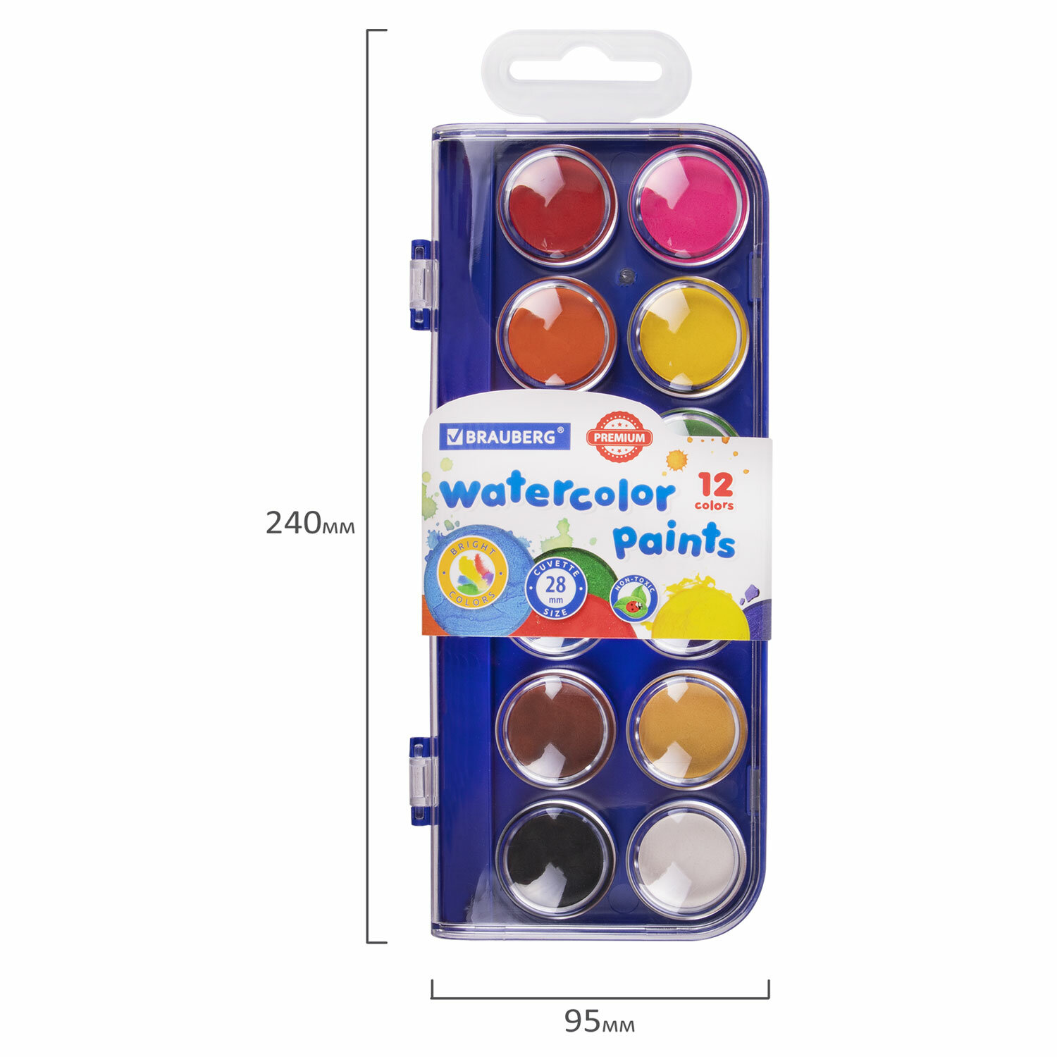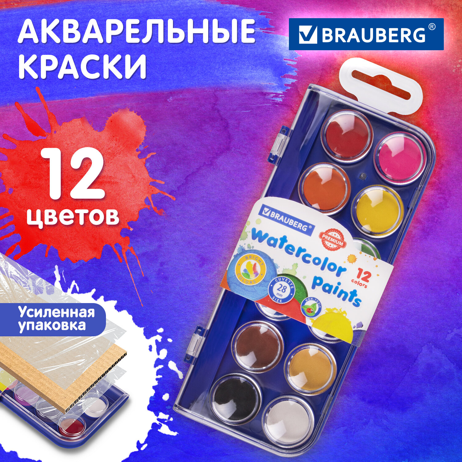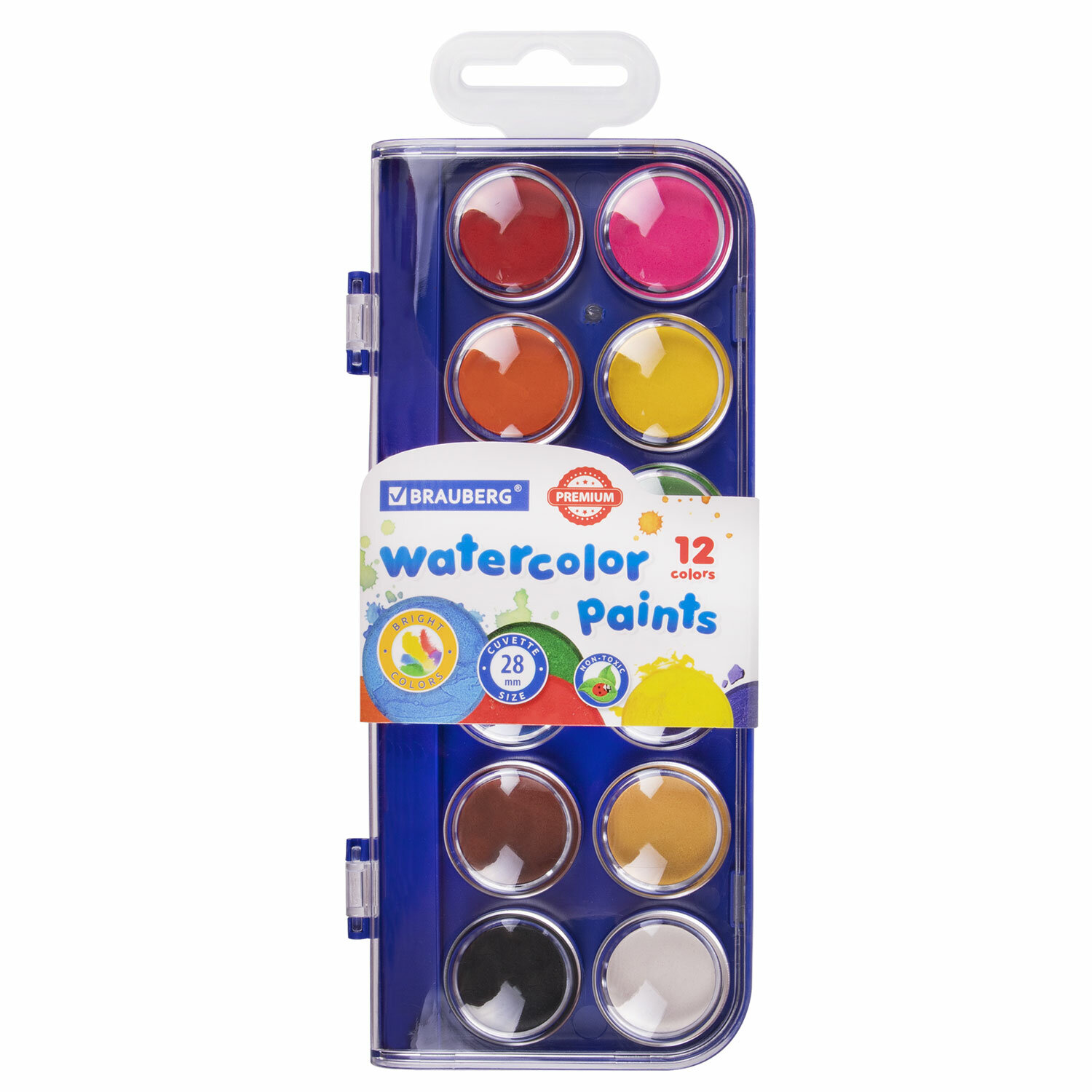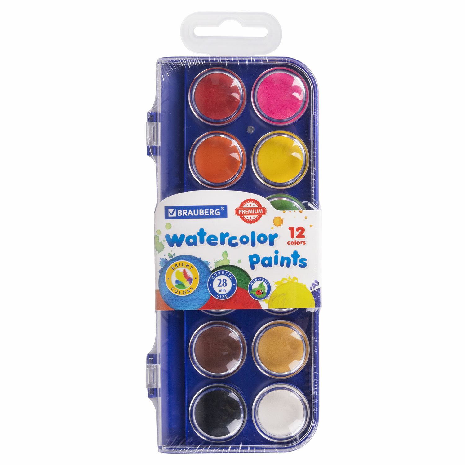 Краски акварельные BRAUBERG "PREMIUM" 12 цветов, круглые кюветы 28 мм, пенал, 881075