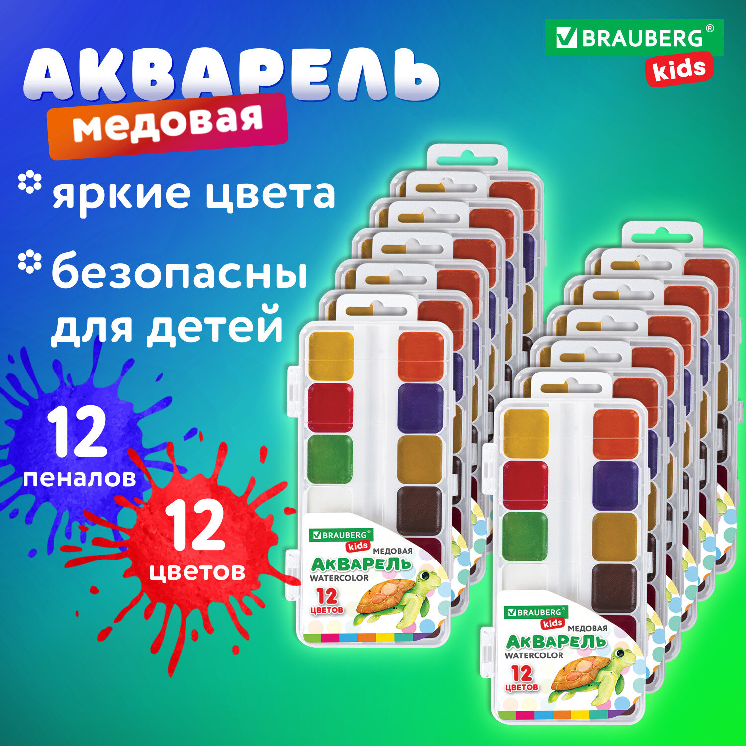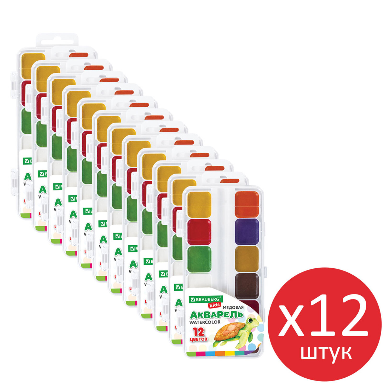 Краски акварельные BRAUBERG KIDS, ВЫГОДНАЯ УПАКОВКА, 12 штук по 12 цветов, медовая, 881078