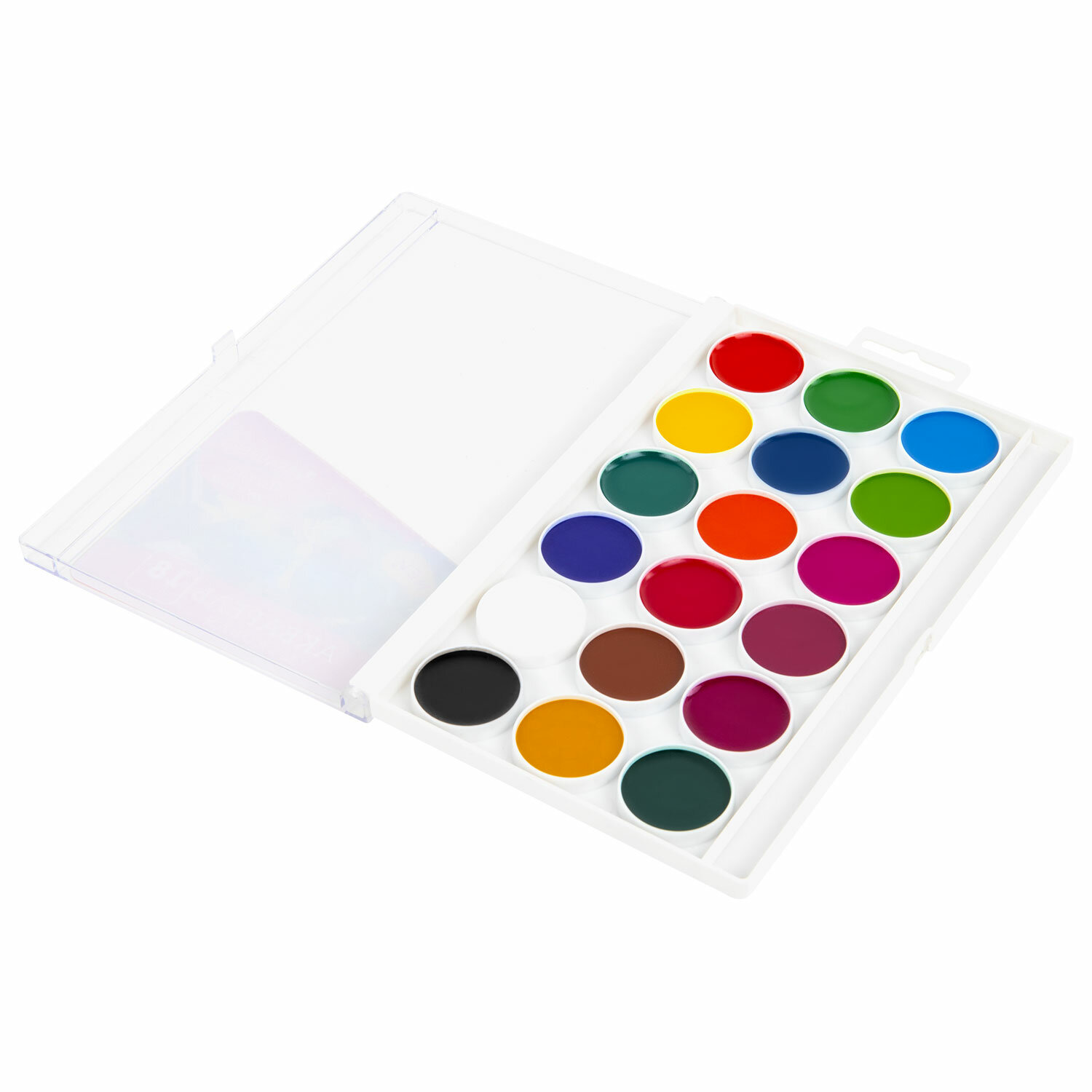 Набор состоит из 2 штук акварельных красок по 18 ярких насыщенных цветов. Краски отлично смешиваются между собой и позволяют создать множество оттенков, обеспечивают однородное окрашивание. Краски быстро высыхают и не портятся со временем. Безопасны для детей, нетоксичны. Выпускаются в пластиковом пенале с европодвесом, прозрачной крышкой, кюветами круглой формы и отделением для кисточки. Упаковка обладает компактными размерами и легким весом.