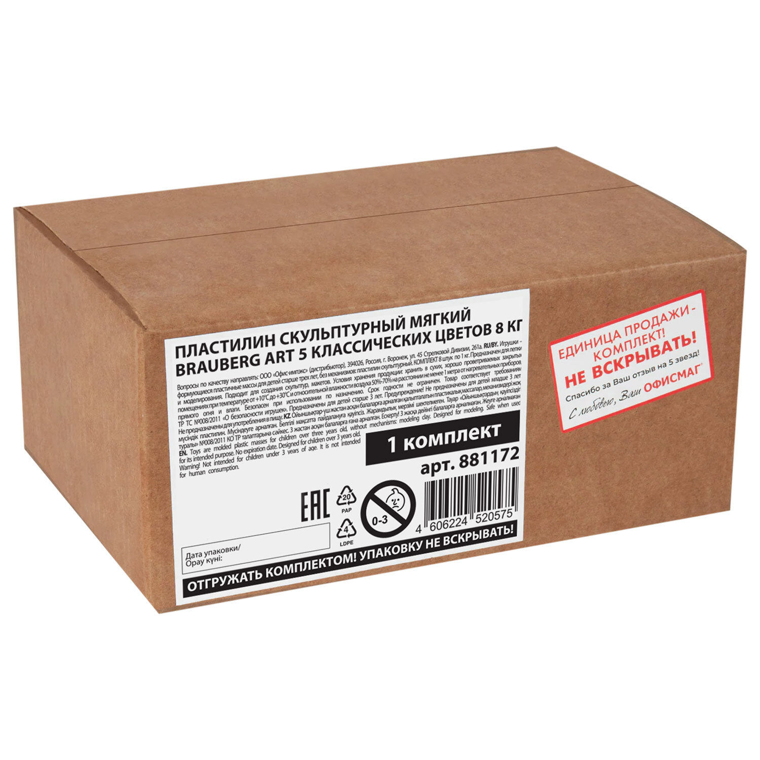 Набор из 8 брусков по 1 кг пластилина, 5 цветов: белый, серый, телесный, терракотовый, оливковый. Отлично держит форму и устойчив к перепадам температуры. Не оставляет пятен, не липнет к рукам. Мягкий скульптурный пластилин более удобен в работе и подойдет даже любителям. Оптимальное для работы скульпторов соотношение мягкости и твердости материала, хорошая пластичность, естественные цвета. Каждый брусок весом 1 кг упакован в термоусадочную пленку и далее бруски упакованы в гофрированную коробку.